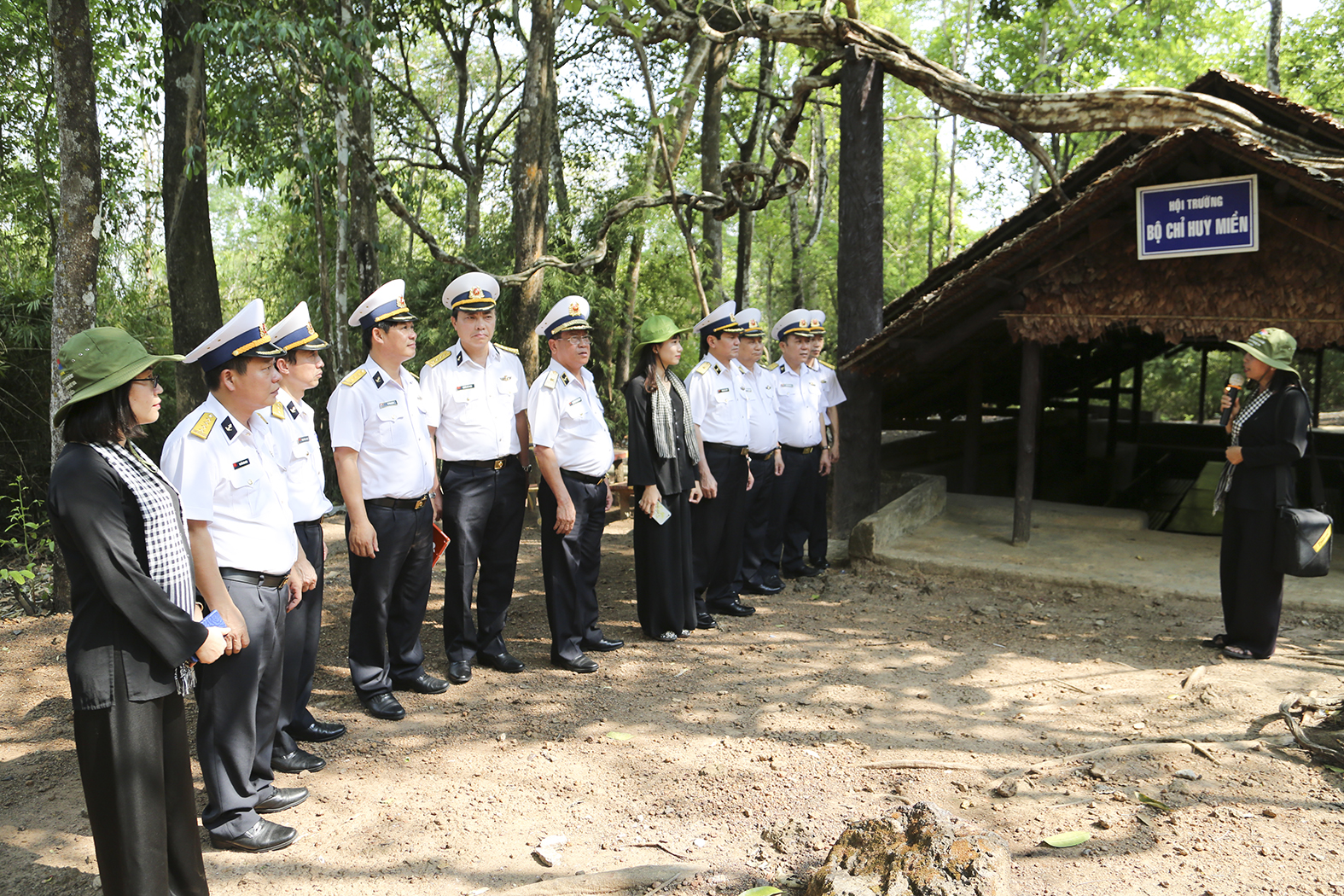 Đoàn công tác nghe hướng dẫn viên khu di tích giới thiệu hội trường Bộ chỉ huy Miền