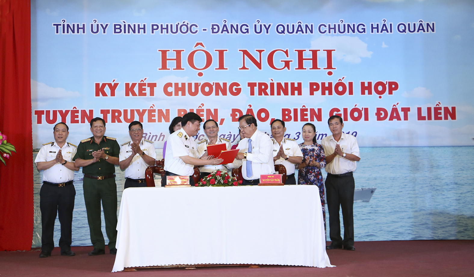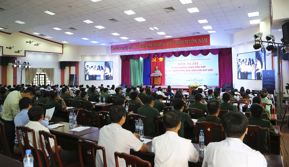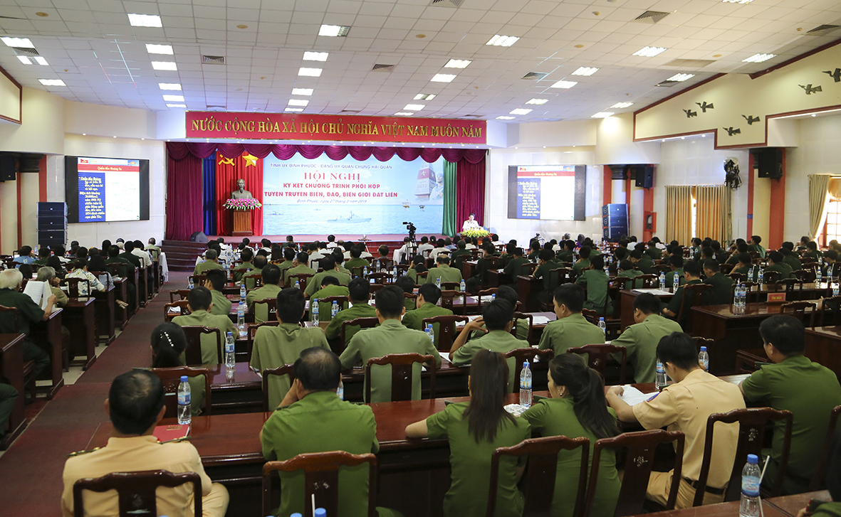 Sáng 27-3, tại TP. Đồng Xoài, tỉnh Bình Phước đã diễn ra Hội nghị ký kết Chương trình phối hợp tuyên truyền biển, đảo, biên giới đất liền giữa Tỉnh uỷ Bình Phước và Đảng uỷ Quân chủng Hải quân. Đồng chí Nguyễn Văn Trăm, Phó Bí thư Tỉnh uỷ, Chủ tịch UBND tỉnh và Chuẩn Đô đốc Phạm Văn Vững, Bí thư Đảng uỷ, Chính uỷ Quân chủng Hải quân đồng chủ trì. Hội nghị được kết nối trực tuyến từ đầu cầu hội trường tỉnh đến 12 điểm cầu gồm thành phố, các huyện, thị xã và Đảng uỷ Công ty TNHH MTV cao su Phú Riềng.