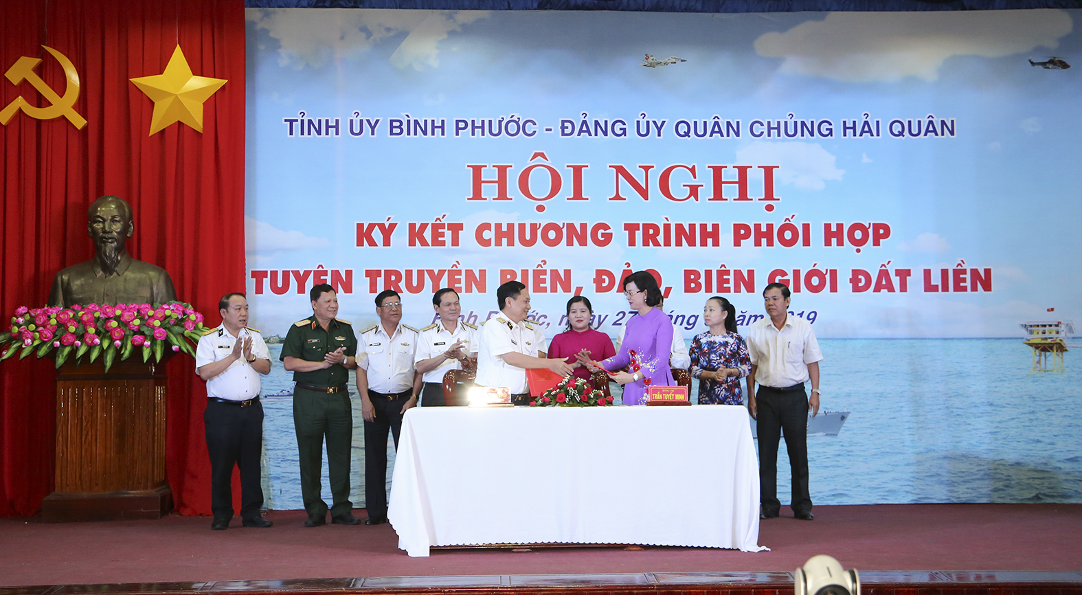 Đồng chí Trần Tuyết Minh, Uỷ viên Ban Thường vụ Tỉnh uỷ, Trưởng ban Tuyên giáo Tỉnh uỷ Bình Phước và Chuẩn Đô đốc Nguyễn Đức Vượng, Chính uỷ Vùng 4 Hải quân ký và trao kế hoạch phối hợp công tác năm 2019 giữa Ban Tuyên giáo Tỉnh uỷ Bình Phước và Vùng 4 Hải quân