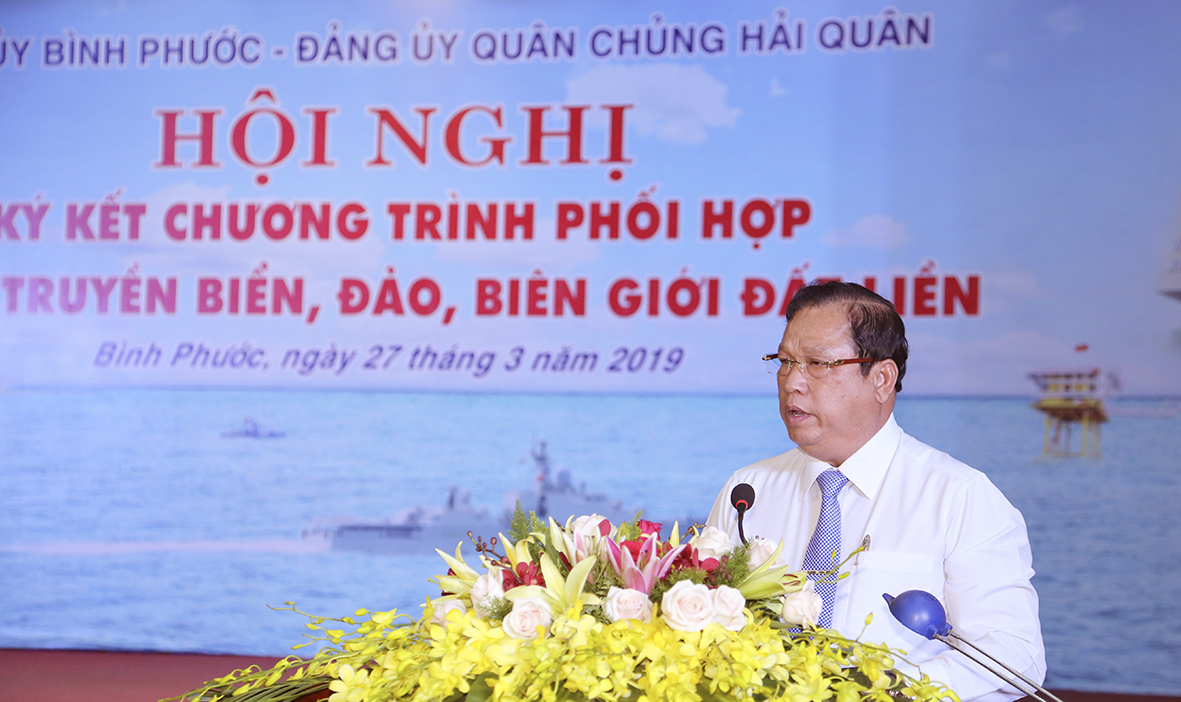Đồng chí Nguyễn Văn Trăm và Chuẩn Đô đốc Phạm Văn Vững đã phát biểu khẳng định: Biển, đảo Việt Nam là không gian bất khả xâm phạm. Bảo vệ chủ quyền biển, đảo là trách nhiệm thiêng liêng của mỗi người dân Việt Nam. Chương trình phối hợp tuyên truyền biển, đảo, biên giới đất liền có vai trò, ý nghĩa hết sức quan trọng đối với quân dân tỉnh Bình Phước và cán bộ, chiến sĩ Hải quân trong tình hình hiện nay.
