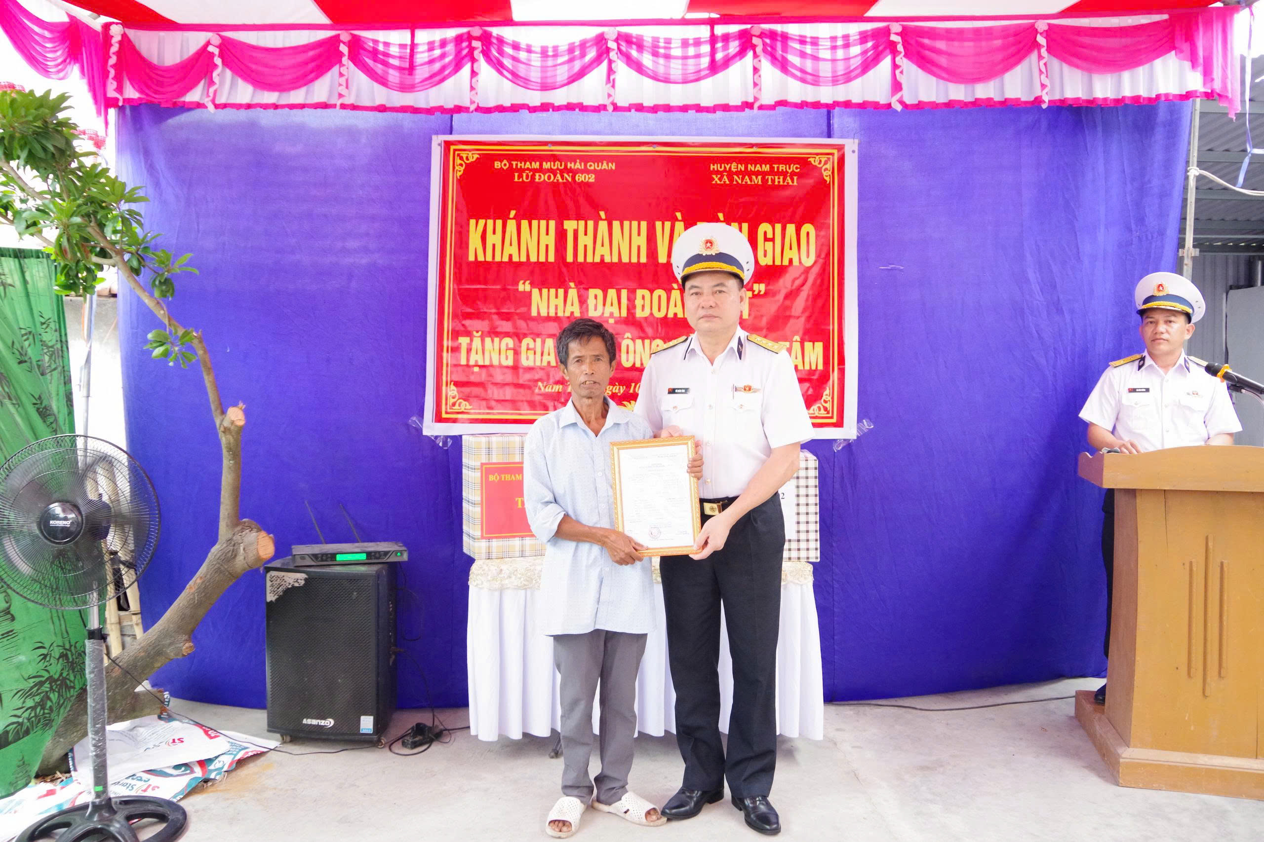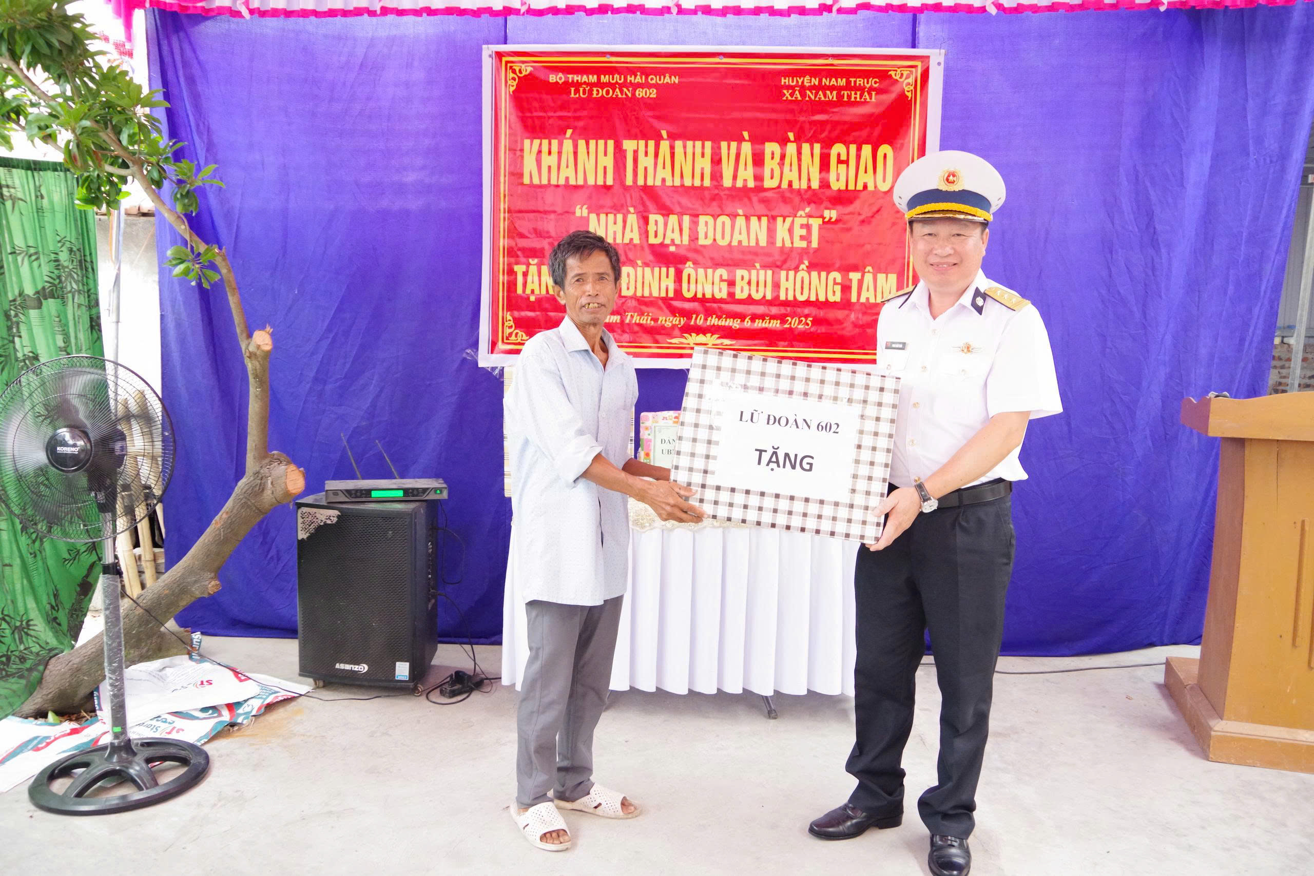 Ngày 10/6, Bộ Tham mưu Hải quân phối hợp với cấp ủy, chính quyền địa phương xã Nam Thái, huyện Nam Trực, tỉnh Nam Định, tổ chức lễ khánh thành và bàn giao nhà đại đoàn kết cho gia đình ông Bùi Hồng Tâm, hộ nghèo có hoàn cảnh đặc biệt khó khăn về nhà ở.