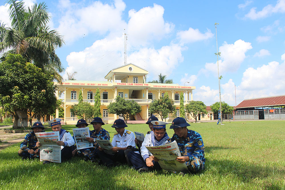Đọc báo trên thao trường huấn luyện Lữ đoàn Thông tin 602, Bộ Tham mưu Hải quân. Ảnh: Phạm Toàn