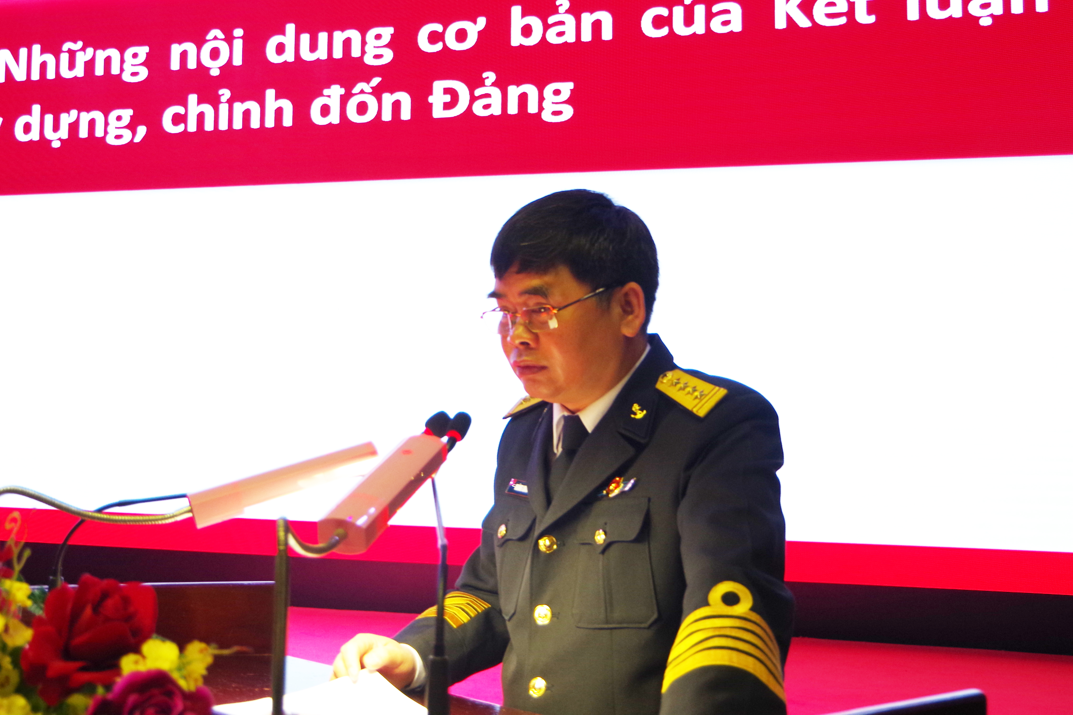 Đại tá Hoàng Lương Ngọc, Phó Tham mưu trưởng Hải quân, Bí thư Đảng ủy Bộ Tham mưu chủ trì hội nghị và trực tiếp giới thiệu những nội dung cơ bản trong Kết luận số 21-KL/TW ngày 25/10/2021 của Hội nghị lần thứ Tư Ban Chấp hành Trung ương Đảng Khóa XIII về đẩy mạnh xây dựng, chỉnh đốn Đảng và hệ thống chính trị; kiên quyết ngăn chặn, đẩy lùi, xử lý nghiêm cán bộ, đảng viên suy thoái về tư tưởng chính trị, đạo đức, lối sống, biểu hiện “tự diễn biến”, “tự chuyển hóa”; Quy định số 37-QĐ/TW ngày 25/10/2021 của Ban Chấp hành Trung ương Đảng Khóa XIII về những điều đảng viên không được làm.