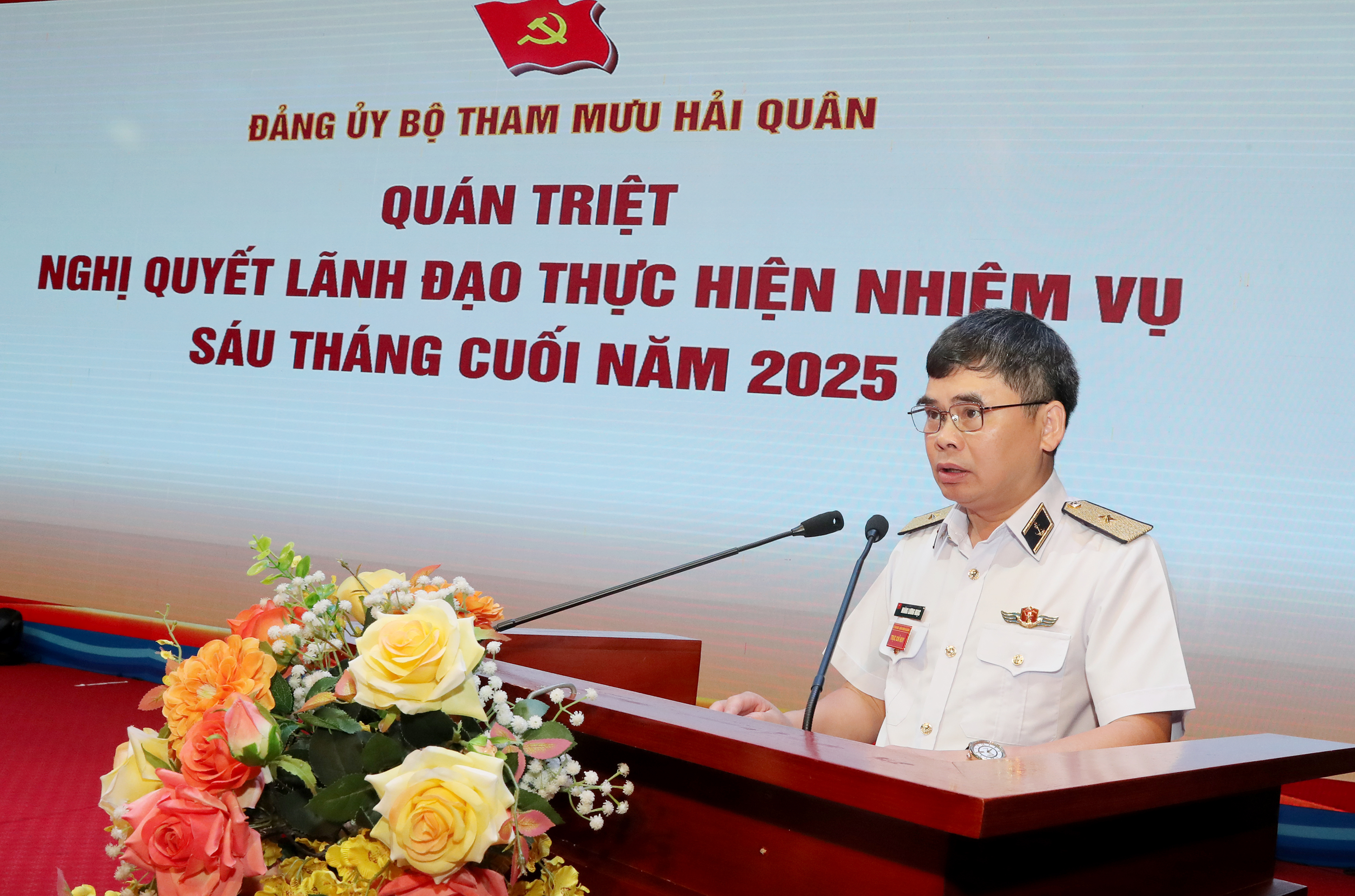 Chuẩn Đô đốc Hoàng Lương Ngọc, Bí thư Đảng ủy Bộ Tham mưu, Phó Tham mưu trưởng Hải quân quán triệt nghị quyết của Đảng ủy lãnh đạo thực hiện nhiệm vụ 6 tháng cuối năm 2025.