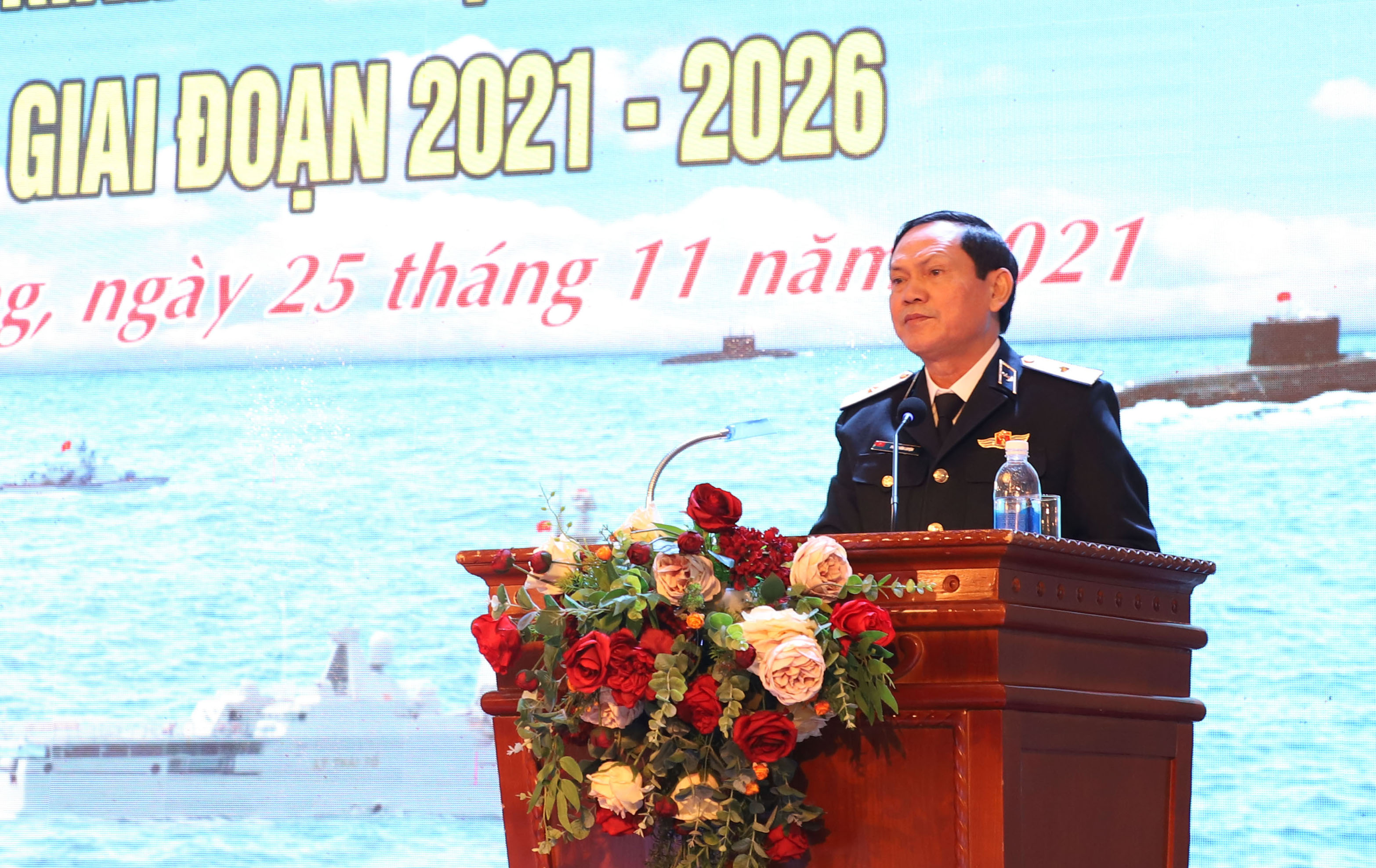 Chuẩn Đô đốc Phạm Văn Luyện, Phó Chủ nhiệm Chính trị Hải quân trình bày nội dung Chương trình phối hợp tuyên truyền biển, đảo