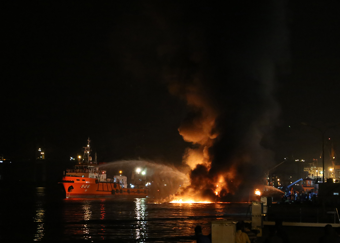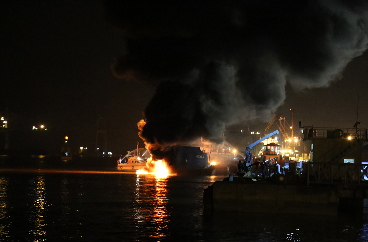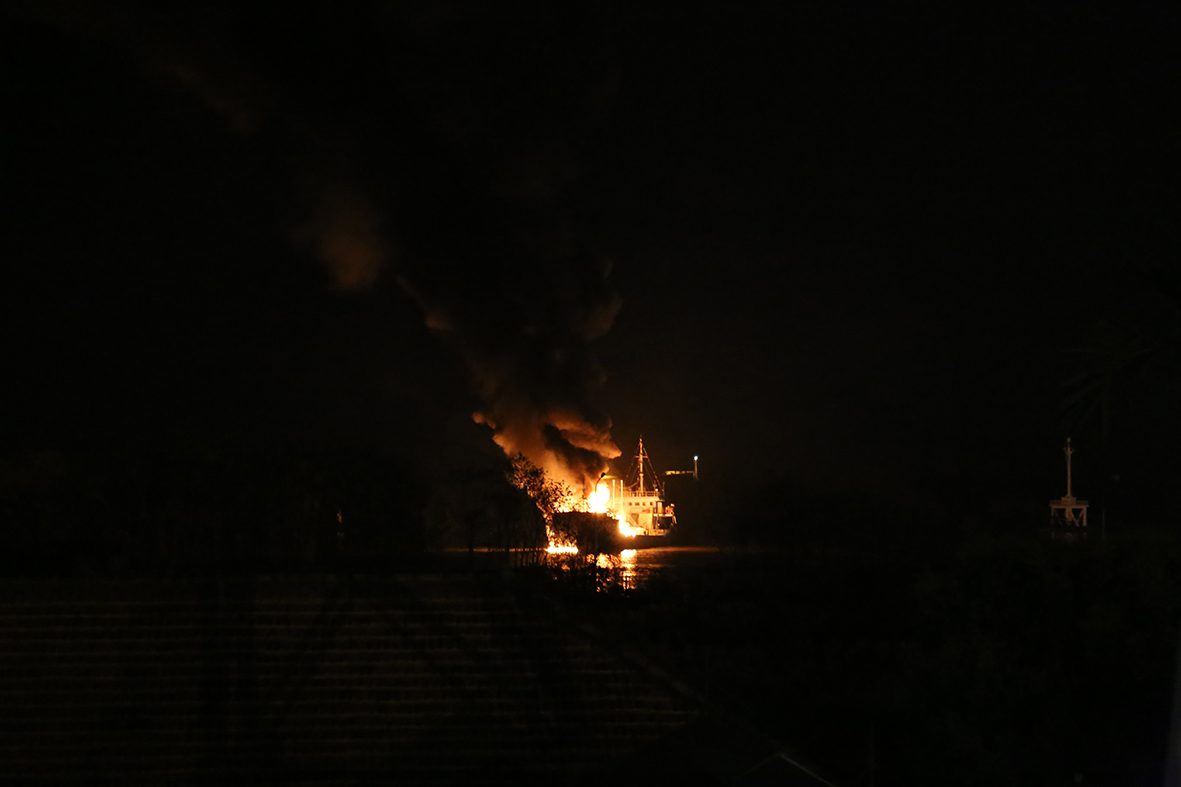Đến sau 19 giờ, công tác chữa cháy đang gặp nhiều khó khăn do gió lớn, các xe chữa cháy không thể phun nước được tới phần thân tàu đang cháy to do chỉ có phần mũi đang chếch vào bờ.