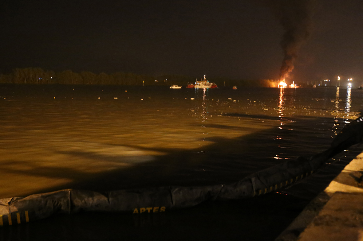 Tàu 703, 704 kéo hệ thống phao quây trên biển ngăn chặn lượng dầu tràn vào khu vực luồng Hải Phòng. Tàu 999 triển khai hệ thống phao quây trên sông, các lực lượng trên bờ đã nhanh chóng đưa các phương tiện đáp ứng với yêu cầu chữa cháy trong thời gian nhanh nhất. Đến 23 giờ, các lực lượng của Hải đoàn 128 đã triển khai xong hệ thống phao quây.