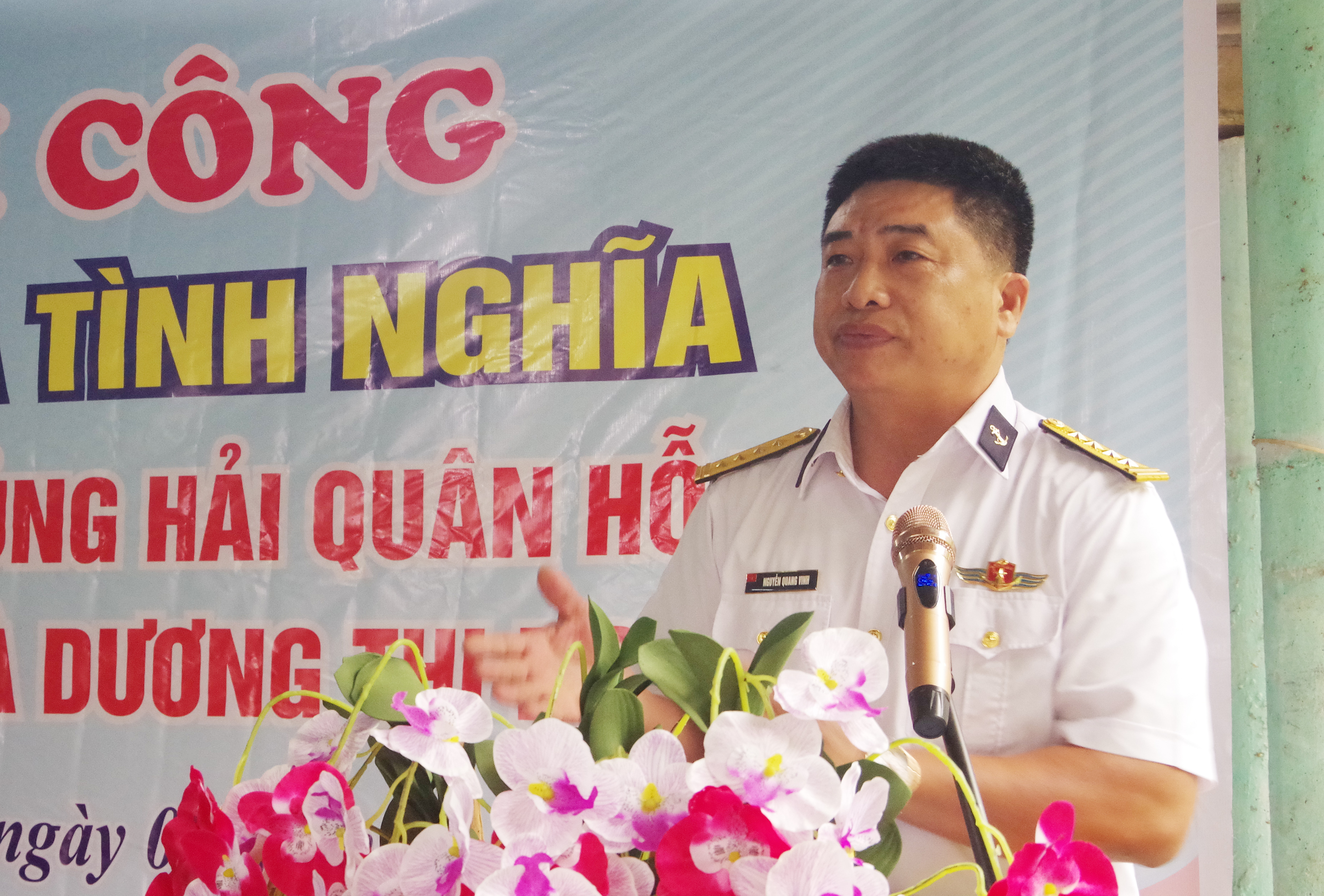 Phát biểu tại buổi lễ, Đại tá Nguyễn Quang Vinh nhấn mạnh: Đây là hoạt động thiết thực, thể hiện đạo lý “Uống nước nhớ nguồn” của dân tộc ta đồng thời là trách nhiệm, tình cảm của cán bộ, chiến sĩ Hải quân đối với những gia đình có công với cách mạng, gia đình chính sách, khó khăn.