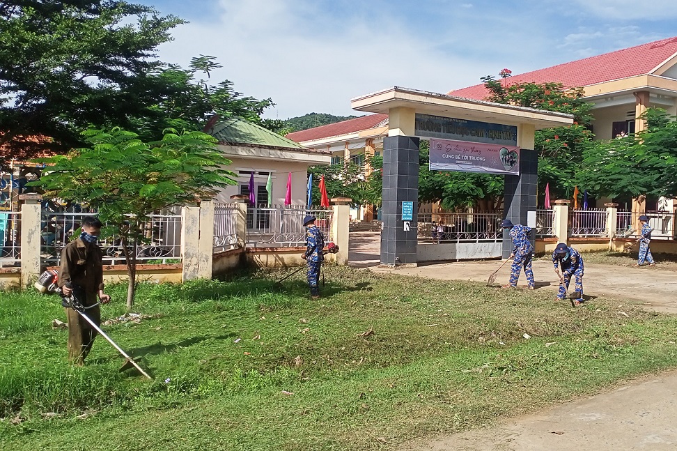 Cán bộ, chiến sĩ Lữ đoàn 957 dọn vệ sinh khu vực trường học