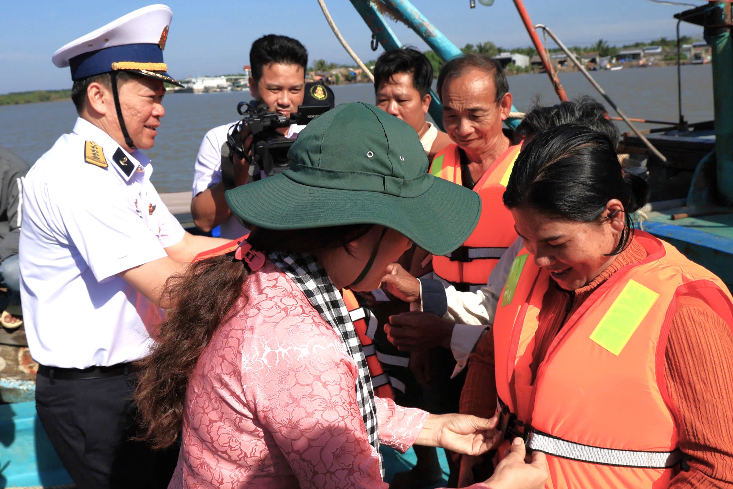 Lãnh đạo các đơn vị trao áo phao tặng bà con ngư dân