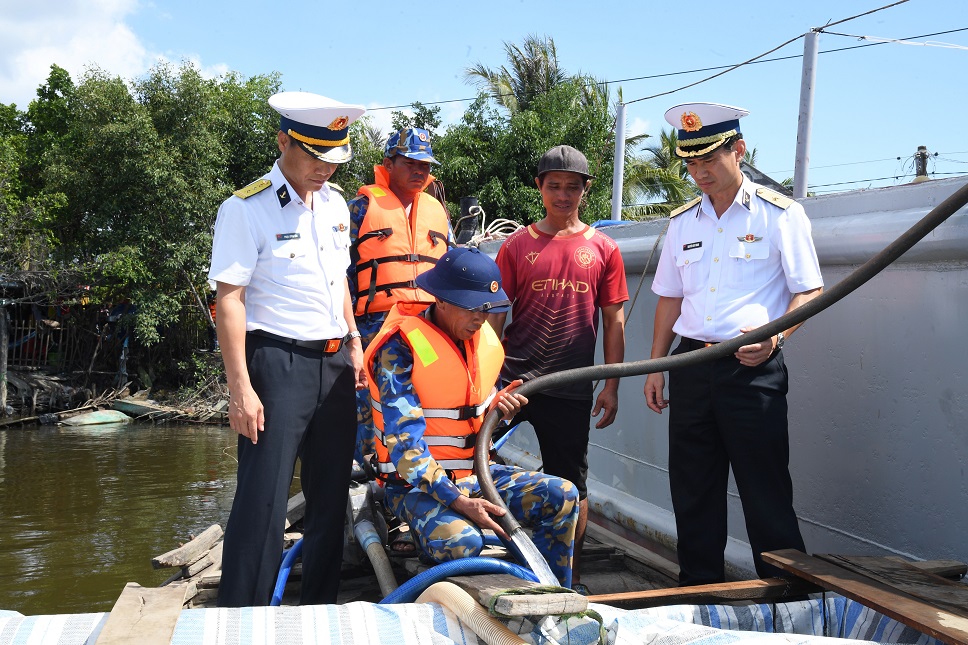 Trao đổi với lãnh đạo và người dân các xã, Chuẩn Đô đốc Nguyễn Hữu Thoan cho biết: Trước tình trạng hạn hán, xâm nhập mặn, thiếu nước cục bộ ở tỉnh Cà Mau, từ ngày 17/4 đến nay, Bộ Tư lệnh Vùng 5 đã điều động các tàu vận chuyển hơn 300m3 nước ngọt từ đảo Phú Quốc (Kiên Giang) vào đất liền cấp miễn phí cho bà con trên địa bàn 4 xã thuộc huyện U Minh và huyện Trần Văn Thời. Hoạt động này vẫn đang được cán bộ, chiến sĩ đơn vị tích cực thực hiện nhằm không để người dân thiếu nước sinh hoạt.