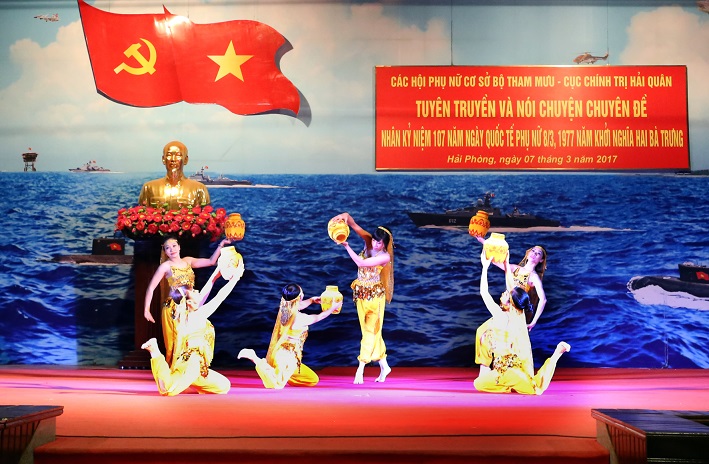 *Sáng 7-3, tại cơ quan Bộ Tư lệnh Hải quân, các Hội phụ nữ cơ sở Bộ Tham mưu, Cục Chính trị đã tổ chức Giao lưu văn hóa văn nghệ, tuyên truyền và nói chuyện chuyên đề nhân kỷ niệm 107 năm ngày Quốc tế phụ nữ 8-3 và 1977 năm khởi nghĩa hai bà Trưng.