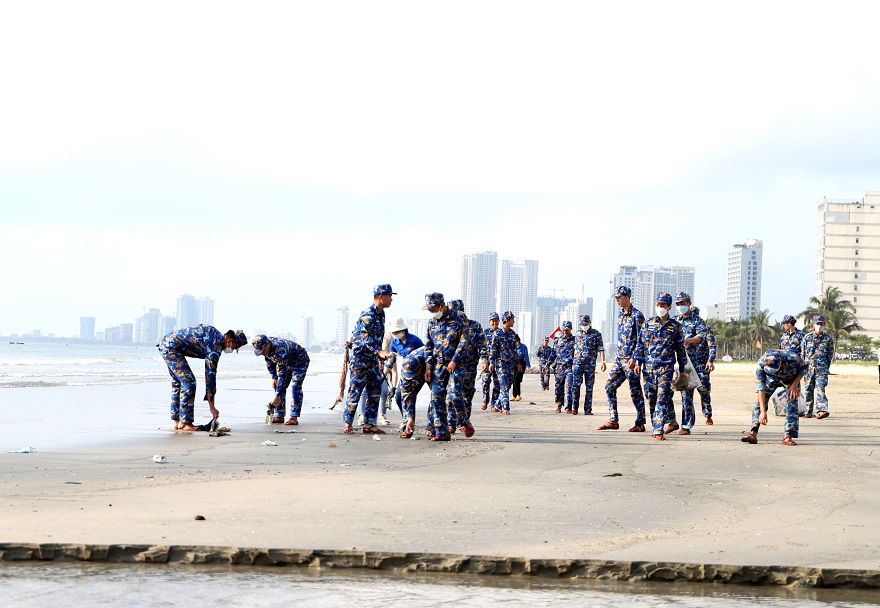 Cán bộ, đoàn viên thanh niên Lữ đoàn 161 và Đoàn phường Thọ Quang thu gom rác thải trên bãi biển tuyến đường Hoàng Sa