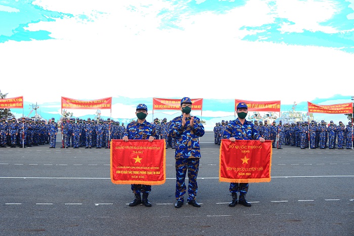 Chuẩn Đô đốc Hoàng Hồng Hà trao cờ thưởng của Chính phủ và Bộ Quốc phòng tặng Lữ đoàn