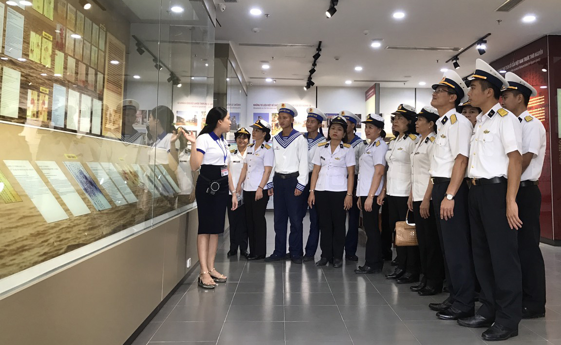 Hội viên và cán bộ, chiến sĩ Lữ đoàn tham quan Nhà trưng bày Hoàng Sa