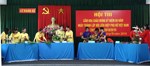 Phần thi cắm hoa của hội viên Hội phụ nữ cơ sở Lữ đoàn 83 và Hội phụ nữ cơ sở Trung đoàn 282