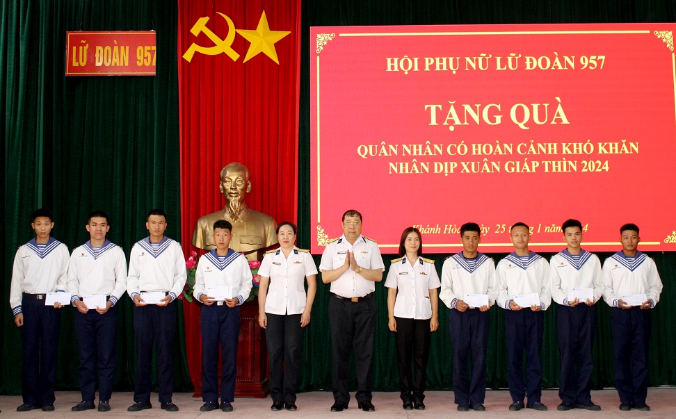Chiều 25/1, tại TP. Cam Ranh, tỉnh Khánh Hòa, Hội phụ nữ Lữ đoàn 957, Vùng 4 Hải quân tổ chức gặp mặt, tặng quà quân nhân của đơn vị có hoàn cảnh khó khăn nhân dịp tết Nguyên đán Giáp Thìn 2024. Đại tá Phạm Quang Trung, Bí thư Đảng ủy, Chính ủy Lữ đoàn tới dự.