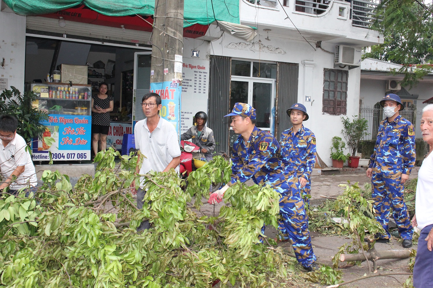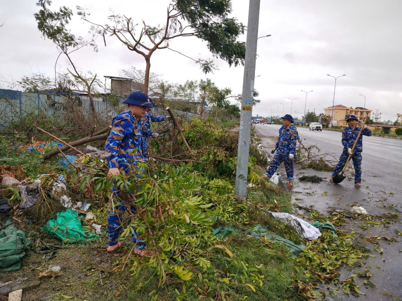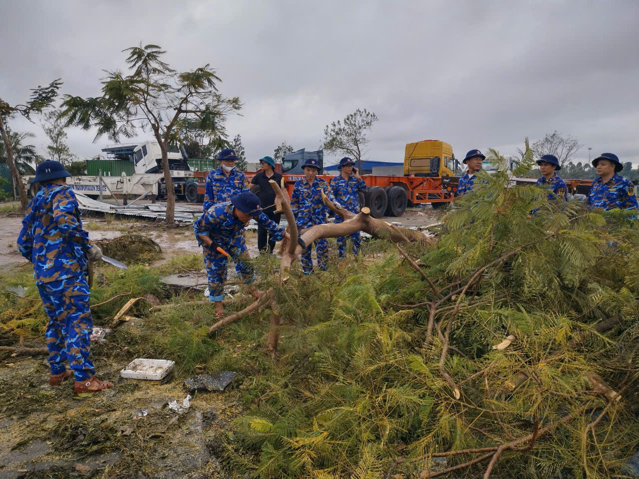 Cán bộ, nhân viên Hải đoàn 128 dọn dẹp cây xanh bị đổ trên tuyến đường Nguyễn Bỉnh Khiêm