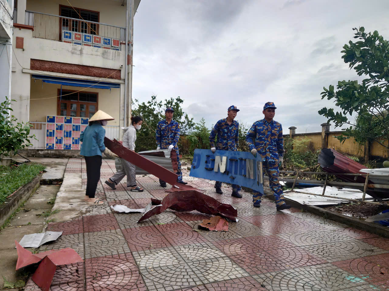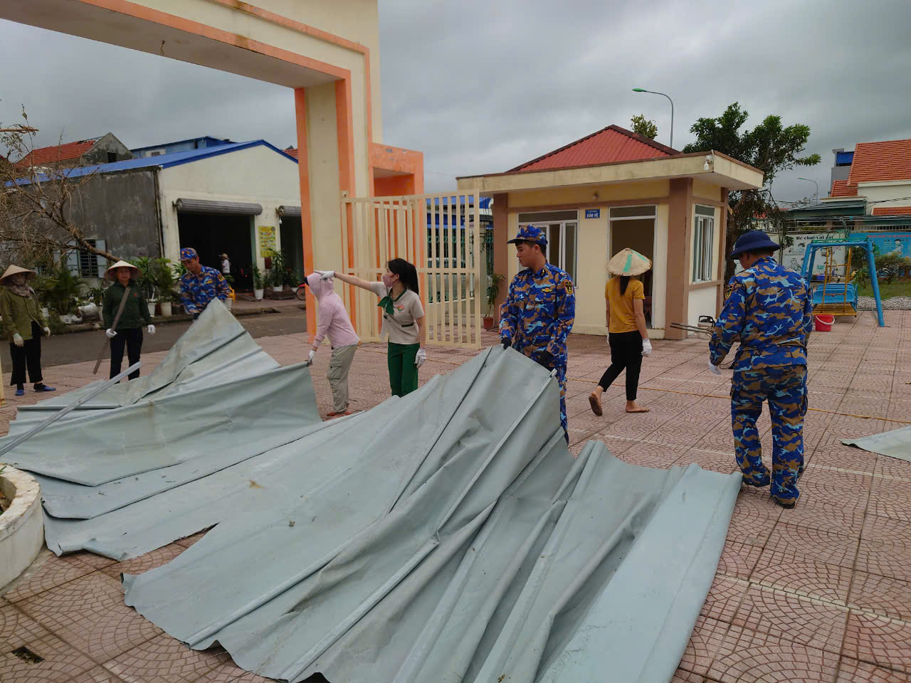 Cán bộ, nhân viên của Trung tâm đã giúp nhà trường vận chuyển các trang thiết bị và đồ dùng học tập của học sinh và thầy cô giáo tới vị trí an toàn; thu gom các mảnh tôn, mảnh nhựa, gạch vữa rơi vỡ; tháo dỡ, vận chuyển các khung mái nhà bị hư hỏng; be bao cát ngăn nước và rác xâm nhập vào phòng học…
