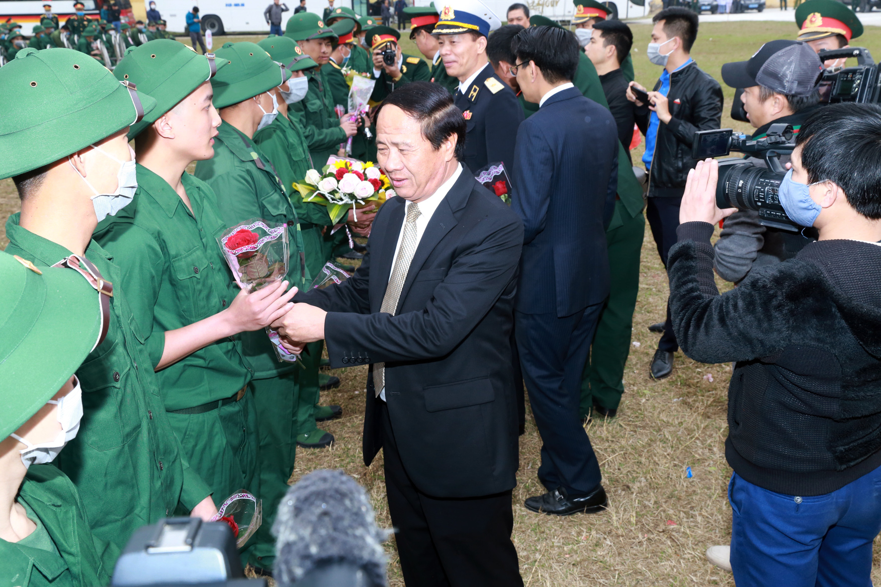 Đồng chí Lê Văn Thành tặng hoa chúc mừng thanh niên nhập ngũ