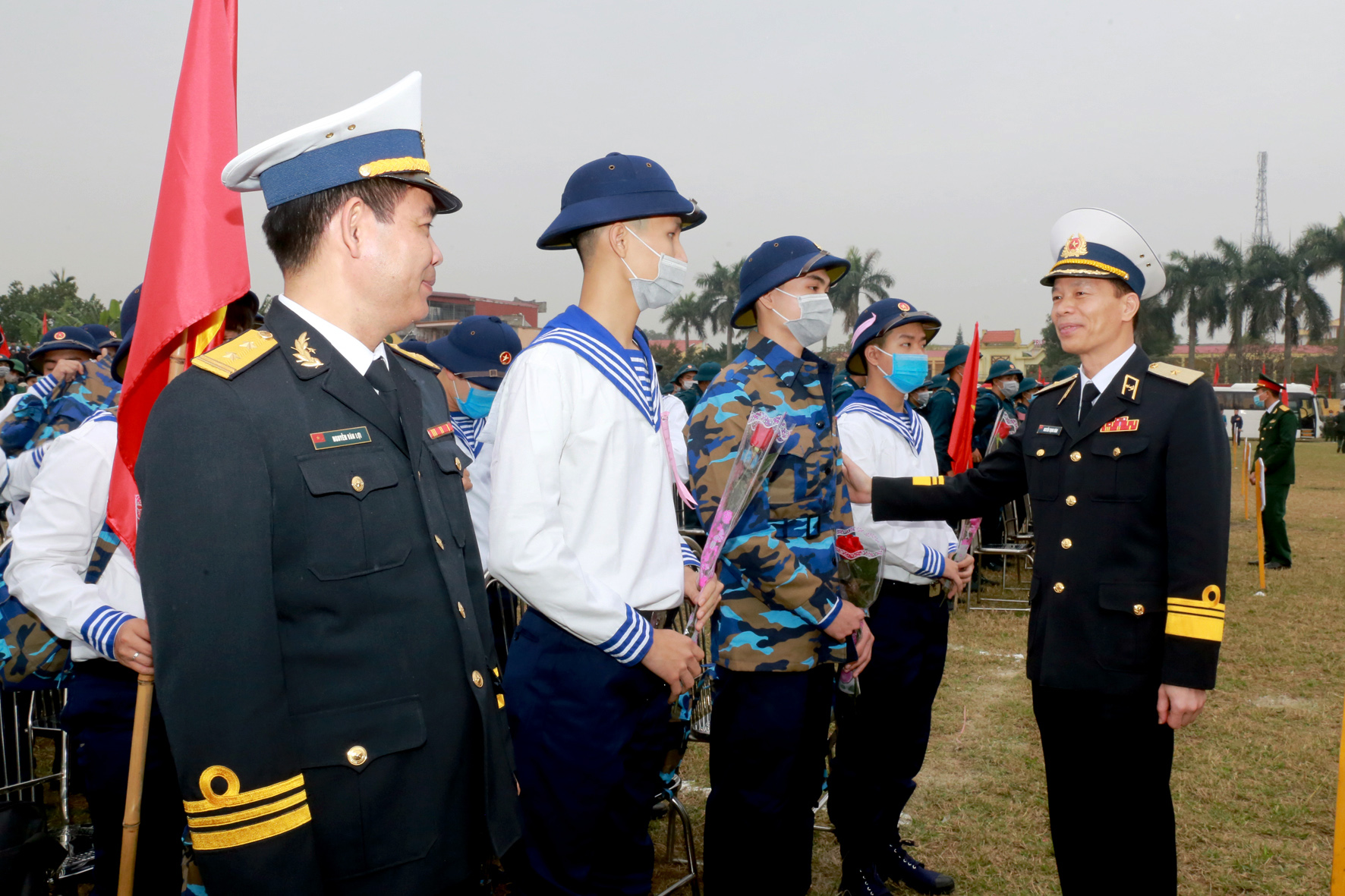 Chuẩn Đô đốc Nguyễn Trọng Bình trò chuyện với thanh niên nhập ngũ vào Quân chủng Hải quân
