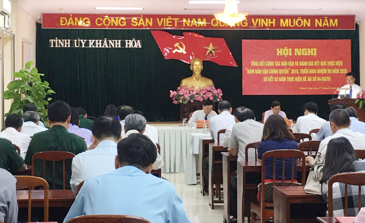 Ngày 17-2, tại TP. Nha Trang, Tỉnh uỷ Khánh Hoà tổ chức Hội nghị “Tổng kết công tác dân vận và đánh giá kết quả thực hiện năm dân vận chính quyền 2019, triển khai nhiệm vụ năm 2020; sơ kết 3 năm thực hiện Đề án “Nâng cao chất lượng và hiệu quả công tác dân vận trên địa bàn tỉnh giai đoạn 2017-2020”".
