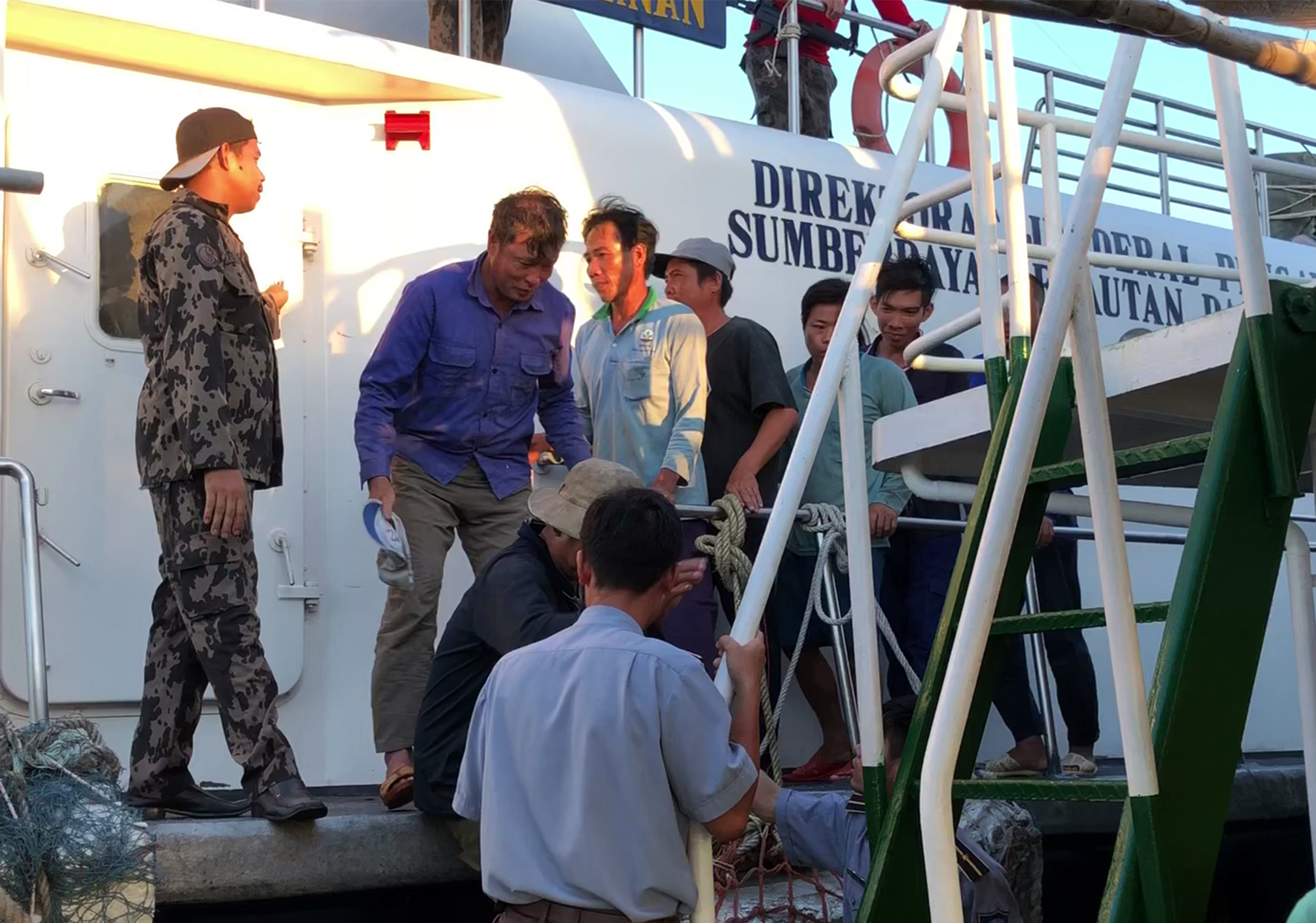 Đại diện Tàu KN 204 tiếp nhận ngư dân từ cơ quan chức năng Indonesia. Ảnh: CTV
