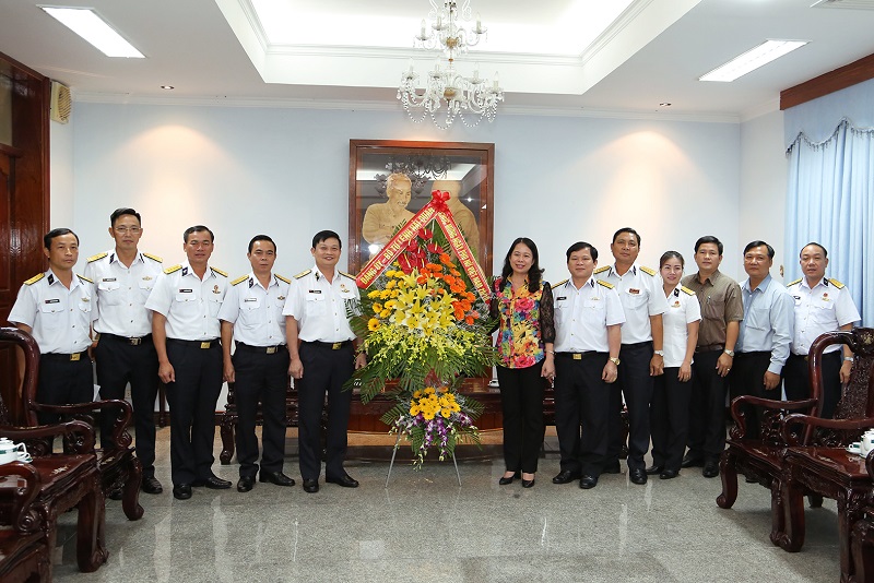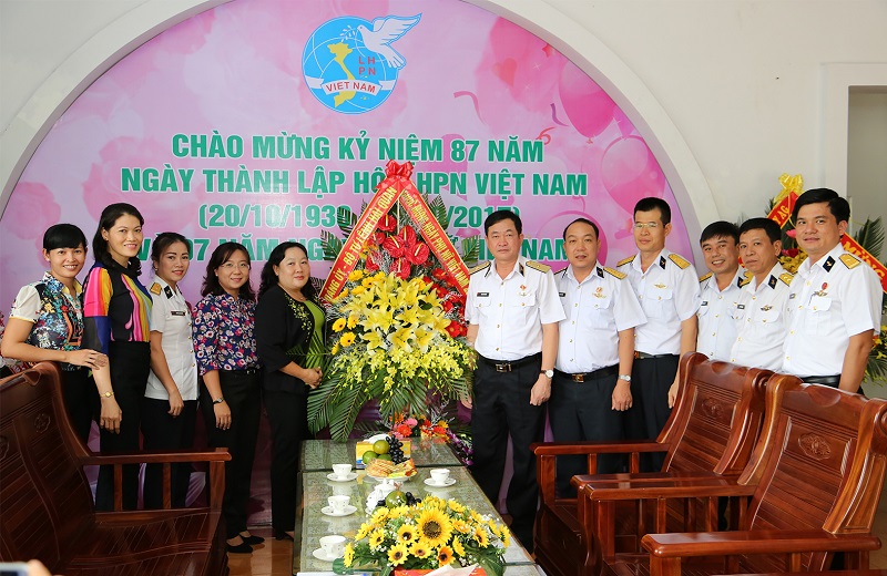 Chuẩn Đô đốc Đoàn Văn Chiều, Phó Chủ nhiệm Chính trị Hải quân tặng hoa chúc mừng Hội liên hiệp Phụ nữ Việt Nam tỉnh An Giang nhân dịp 20-10