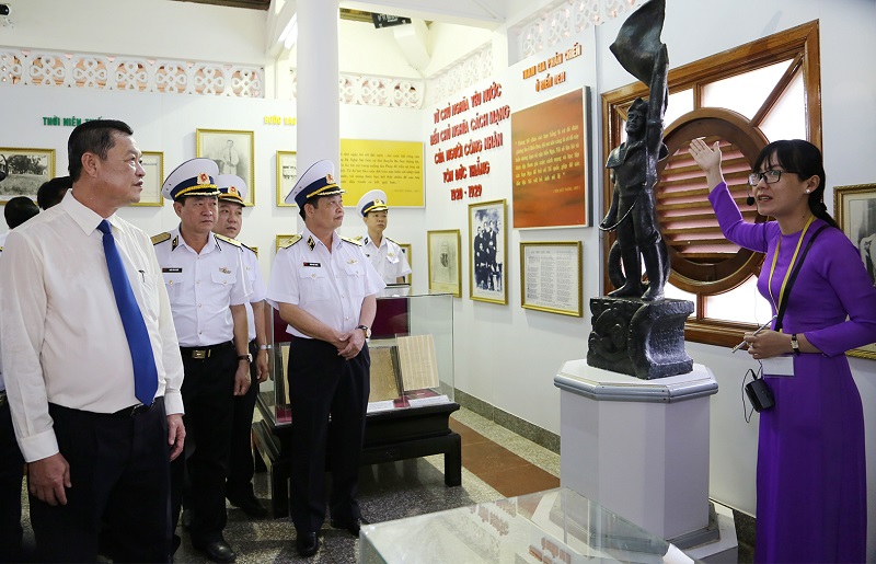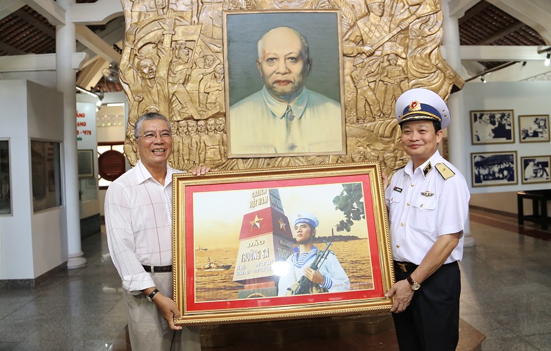 Thiếu tướng Trần Hoài Trung tặng bức ảnh Chiến sĩ Hải quân bảo vệ chủ quyền biển, đảo cho Khu lưu niệm Chủ tịch Tôn Đức Thắng