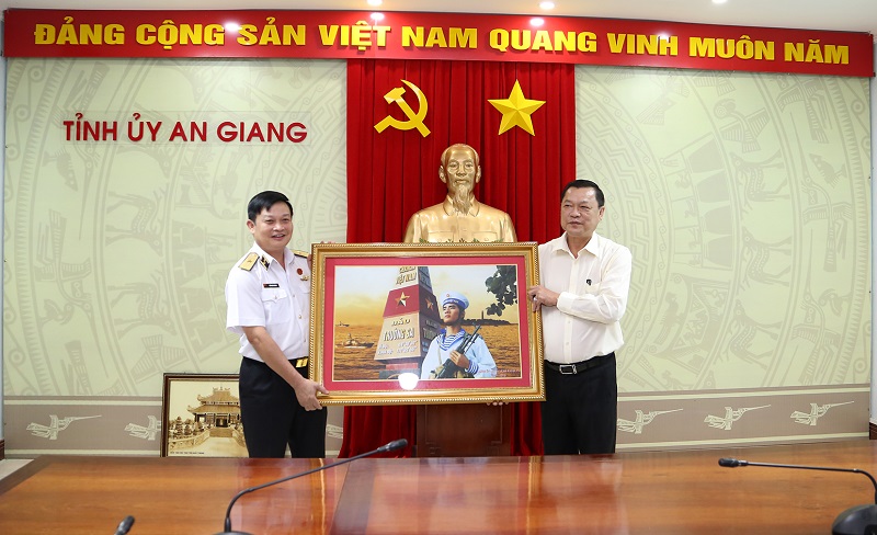 Thiếu tướng Trần Hoài Trung tặng Tỉnh ủy An Giang bức ảnh Chiến sĩ Hải quân bảo vệ chủ quyền biển, đảo