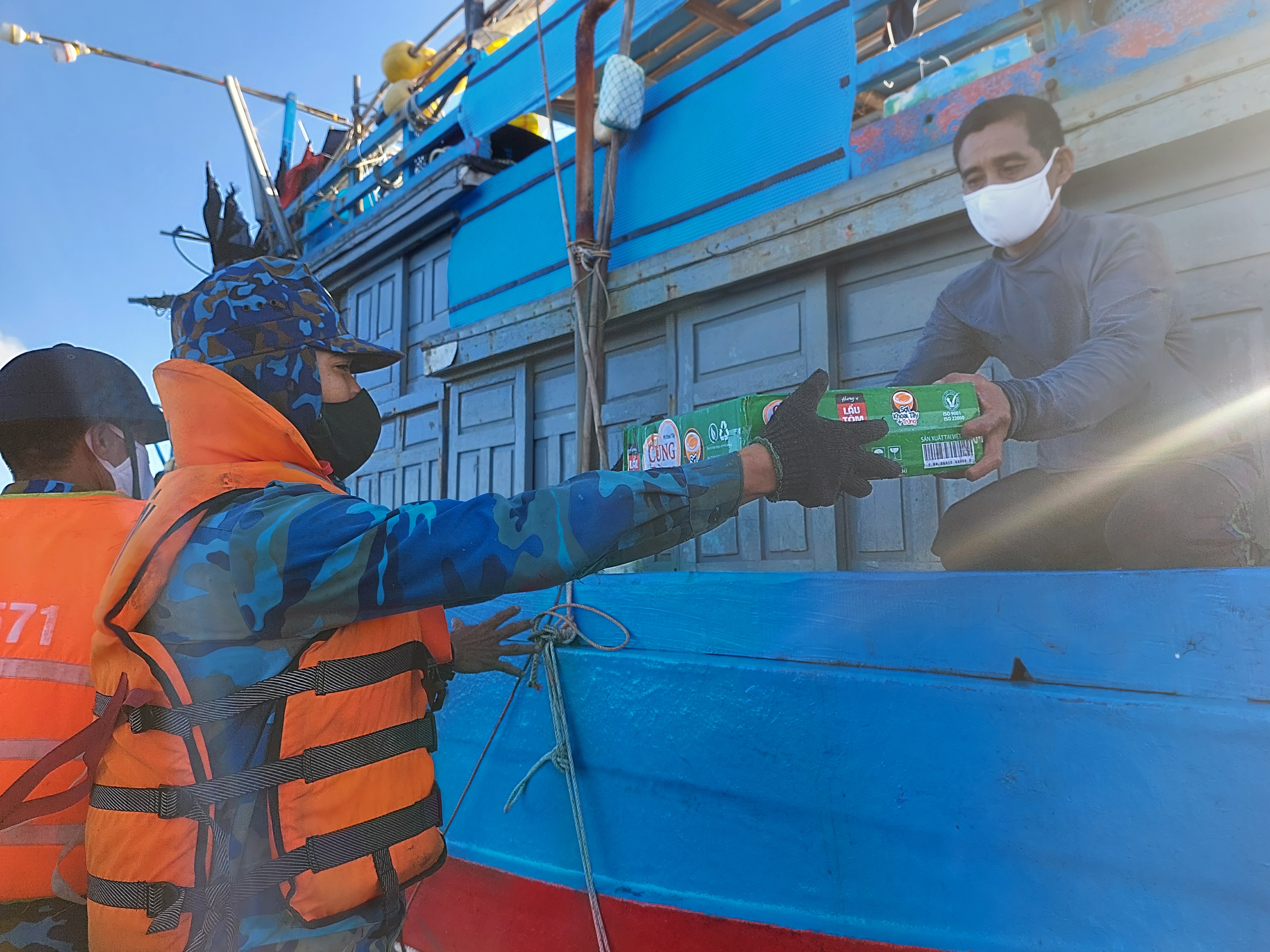 Cán bộ, chiến sĩ đảo Nam Yết hỗ trợ lương thực, thực phẩm cho ngư dân tàu cá QNg 90532 TS