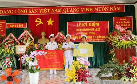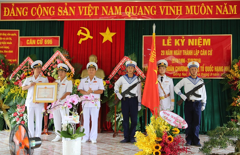 Sáng 19-8, tại huyện Nhơn Trạch, tỉnh Đồng Nai, Căn cứ bảo đảm Kỹ thuật-Hậu cần 696, Vùng 2 Hải quân tổ chức Lễ kỷ niệm 20 năm ngày thành lập (27-8-1996 – 27-8-2016) và đón nhận Huân chương Bảo vệ Tổ quốc hạng Nhì. Tham dự buổi lễ có Chuẩn đô đốc Lê Minh Thành, Phó Tư lệnh Hải quân; lãnh đạo UBND tỉnh Đồng Nai, đại diện các cơ quan Quân chủng, các địa phương và các cơ quan, đơn vị đóng quân trên địa bàn.