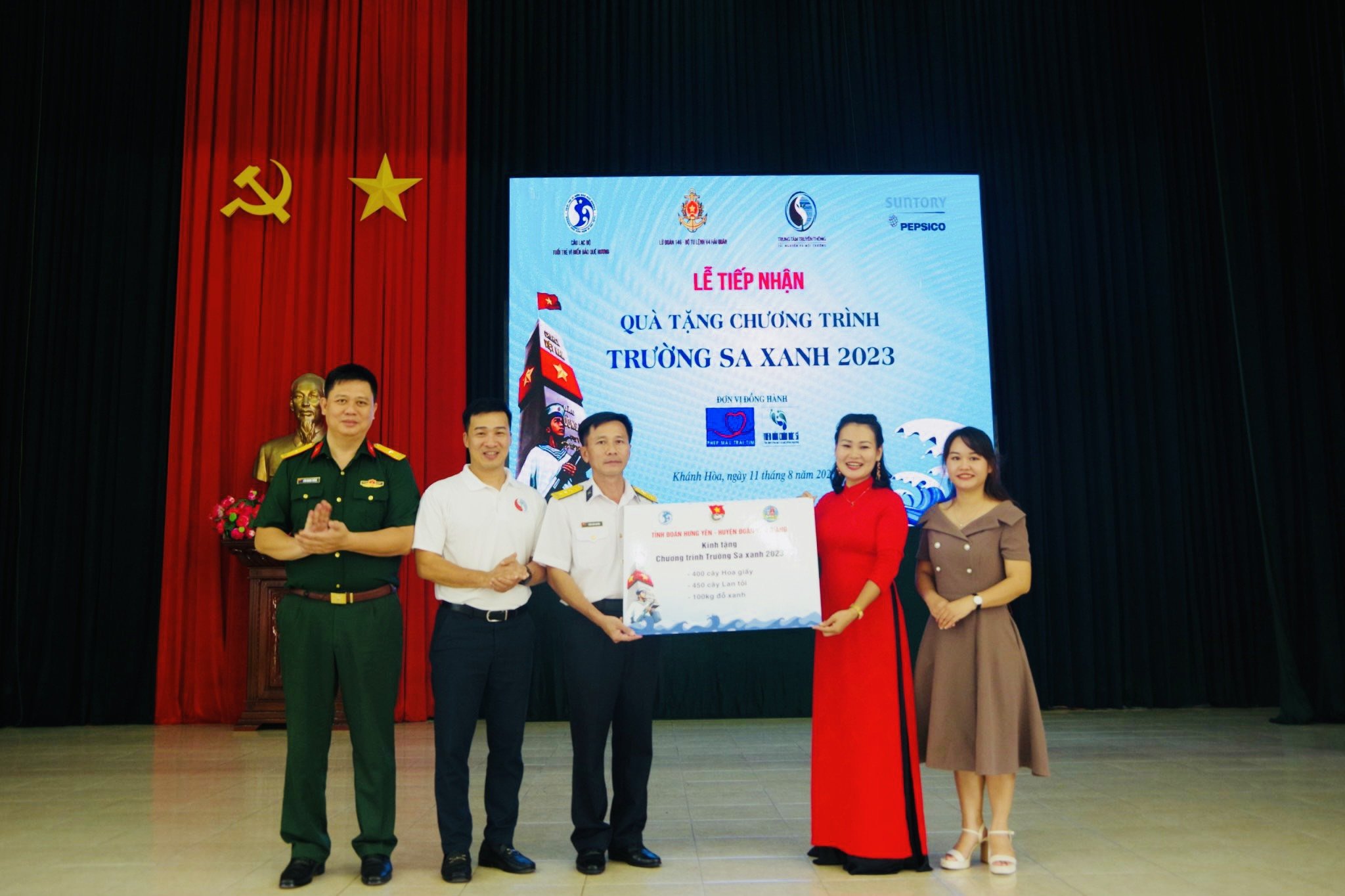 Cô giáo Hải Hoài (người mặc áo dài đỏ) cùng đoàn công tác Huyện đoàn Văn Giang tặng quà chương trình “Trường Sa xanh” tại Vùng 4 Hải quân tháng 8/2023. Ảnh: CTV