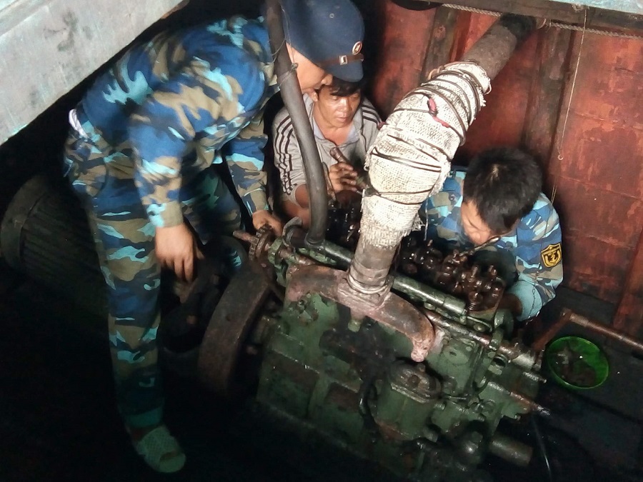 Đội dịch vụ đã khảo sát và tiến hành khắc phục sửa chữa miễn phí cho Tàu cá BĐ 96475TS. Cán bộ, nhân viên âu tàu không kể thời gian ngày, đêm đã sửa chữa thành công hệ thống bơm nước, thông tin liên lạc, máy phát điện.