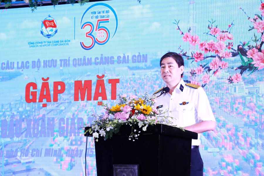 Phát biểu tại buổi họp mặt, Đại tá Ngô Minh Thuấn gửi lời chúc sức khỏe và tri ân các thế hệ đã công tác, công hiến tại Tổng công ty Tân cảng Sài Gòn.
