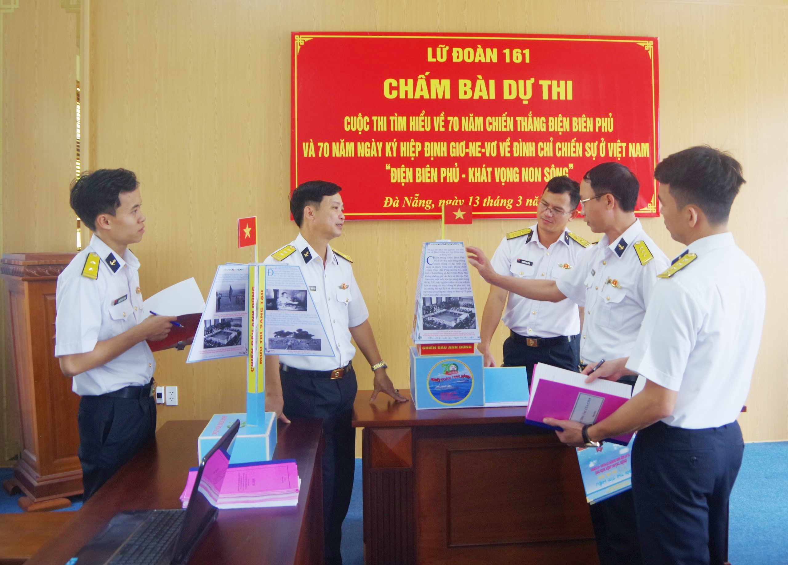 Chiều 13/3, tại TP. Đà Nẵng, Lữ đoàn 161, Vùng 3 Hải quân tổ chức chấm bài dự thi hiểu 70 năm chiến thắng Điện Biên Phủ và 70 năm Ngày ký hiệp định Giơ-ne-vơ về đình chỉ chiến sự ở Việt Nam với chủ đề "Điện Biên Phủ - Khát vọng non sông". Thượng tá Nguyễn Ngọc Nguyên, Phó Chính ủy Lữ đoàn chủ trì.