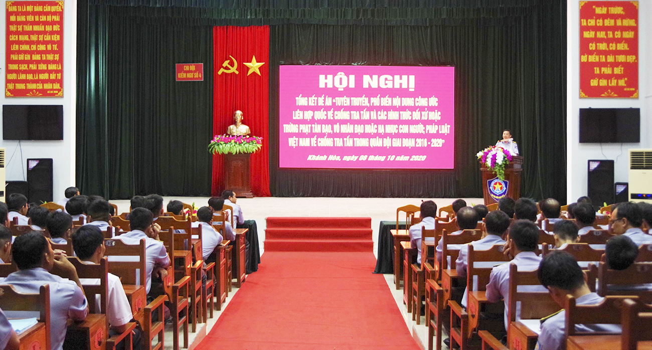 Ngày 8-10, tại TP. Cam Ranh, tỉnh Khánh Hòa, Chi đội Kiểm ngư số 4 tổ chức Tổng kết Đề án “Tuyên truyền, phổ biến nội dung Công ước Liên hợp quốc về chống tra tấn và các hình thức đối xử hoặc trừng phạt tàn bạo, vô nhân đạo hoặc hạ nhục con người; pháp luật Việt Nam về chống tra tấn trong đơn vị giai đoạn 2016-2020”.