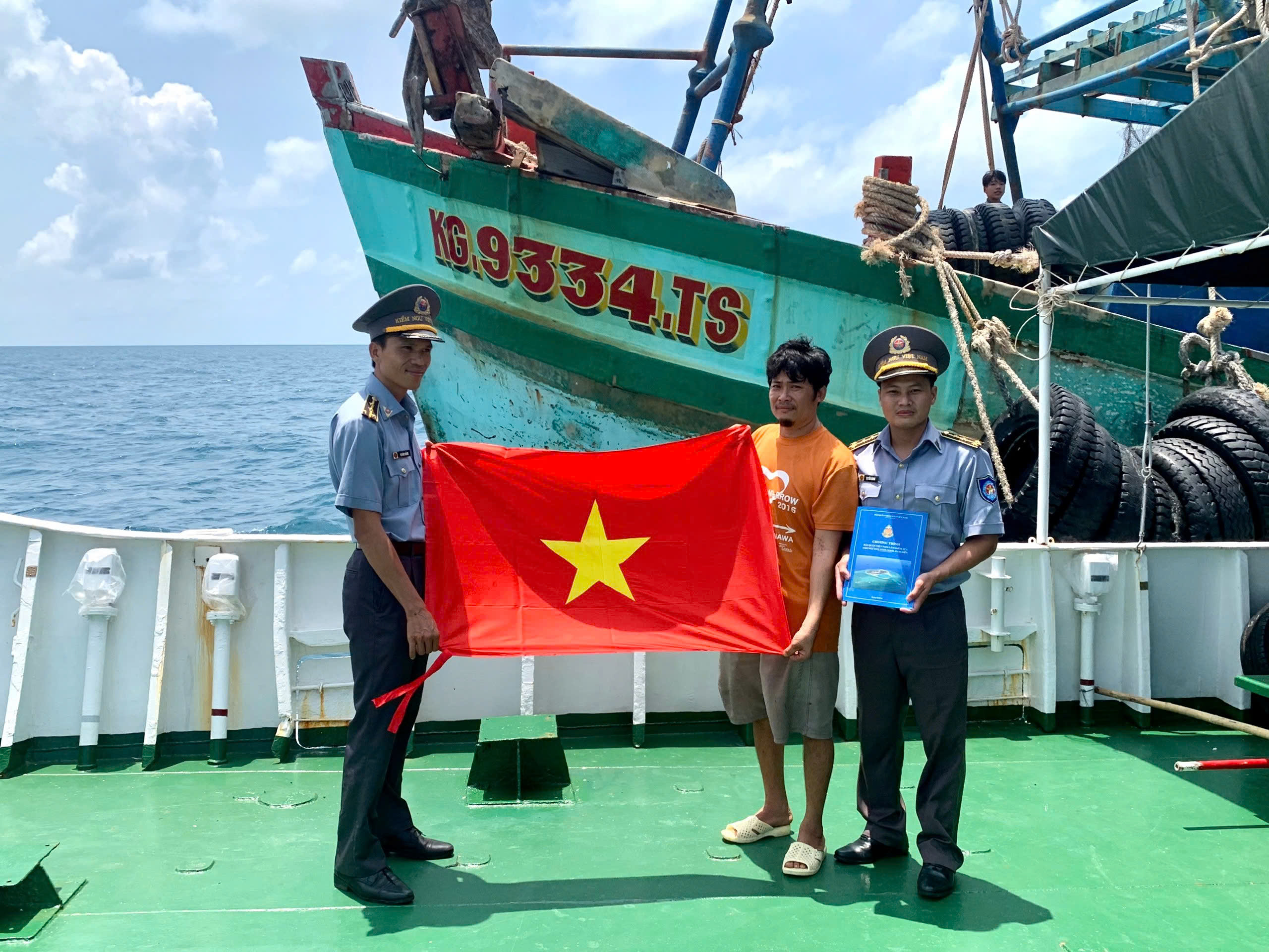 Cán bộ Chi đội Kiểm ngư số 2 tặng cờ Tổ quốc và cấp phát tài liệu tuyên truyền cho ngư dân