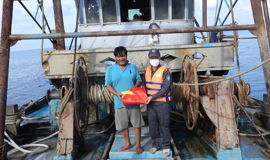 Tặng cờ Tổ quốc cho ngư dân, giúp ngư dân vươn khơi bám biển. Ảnh: CTV