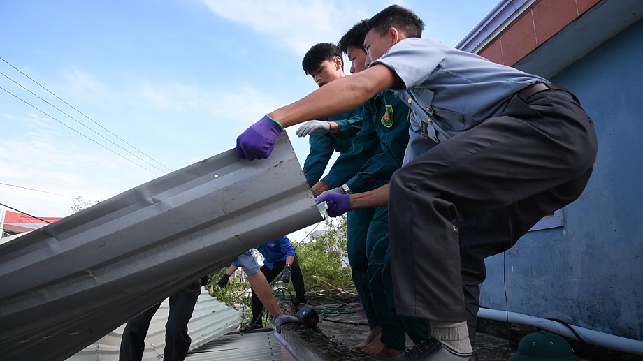 Cán bộ, nhân viên Chi đội Kiểm ngư số 3 cùng dân quân và Đoàn thanh niên của xã đã tích cực giúp 5 hộ gia đình có hoàn cảnh khó khăn, bị tốc hoàn toàn mái nhà, mái hiên. Các lực lượng đã thu dọn tôn và lợp lại để bà con ổn định cuộc sống sau bão.