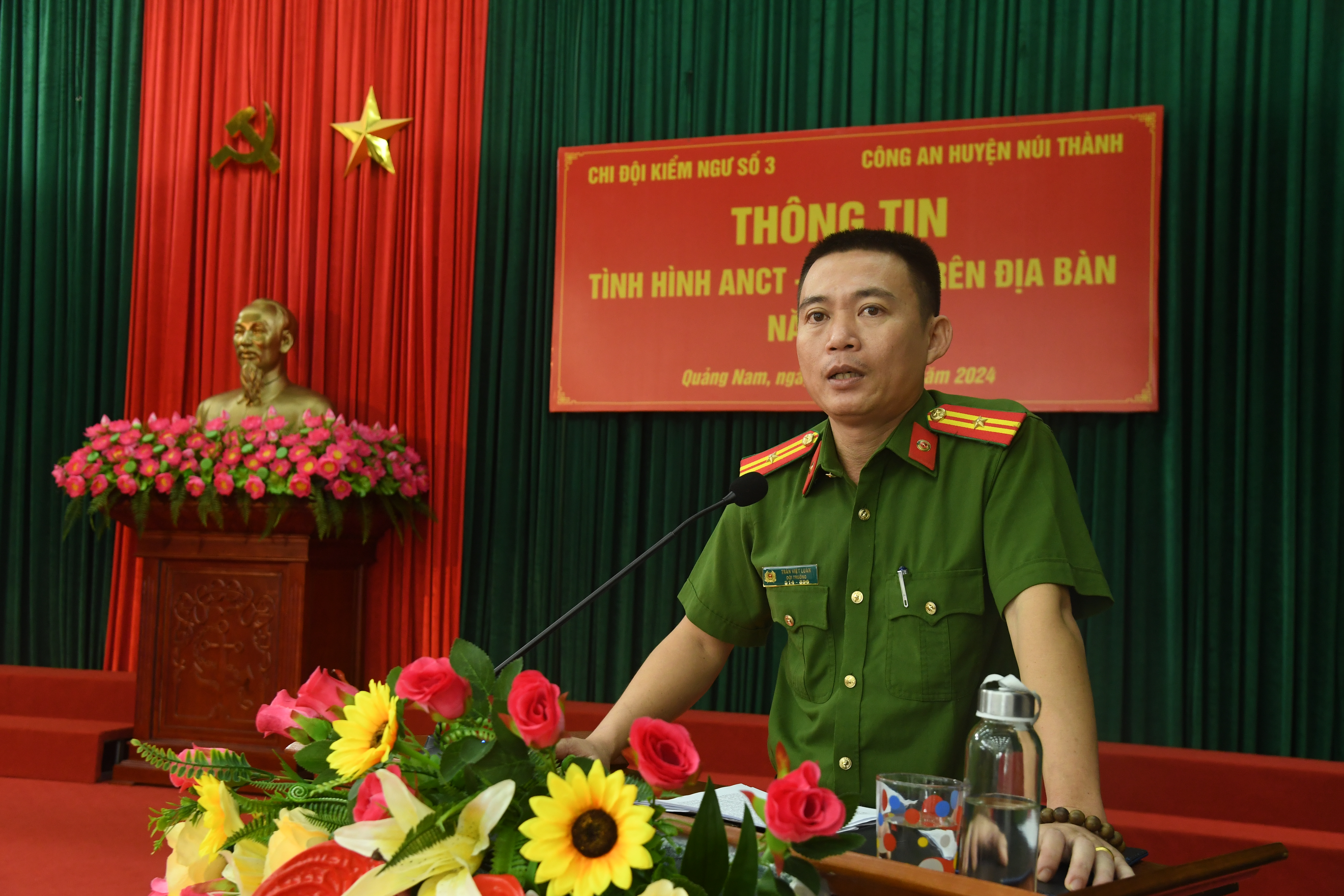 Báo cáo viên của Công an huyện Núi Thành đã thông tin đến cán bộ, nhân viên Chi đội về tình hình an ninh chính trị, trật tự an toàn xã hội trên địa bàn tỉnh Quảng Nam năm 2024. Nổi lên là một số loại tội phạm lừa đảo qua mạng xã hội, tội phạm ma túy, vi phạm các quy định khi tham gia giao thông nhất là vi phạm nồng độ cồn… vẫn diễn biến phức tạp.