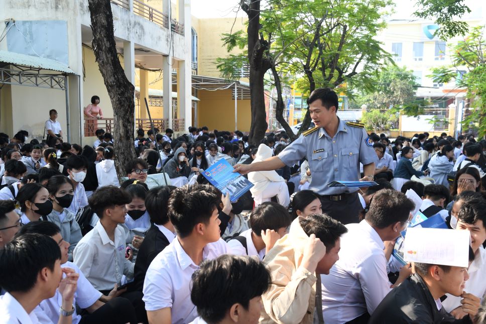 Cán bộ Chi đội phát tài liệu tuyên truyền cho các em học sinh
