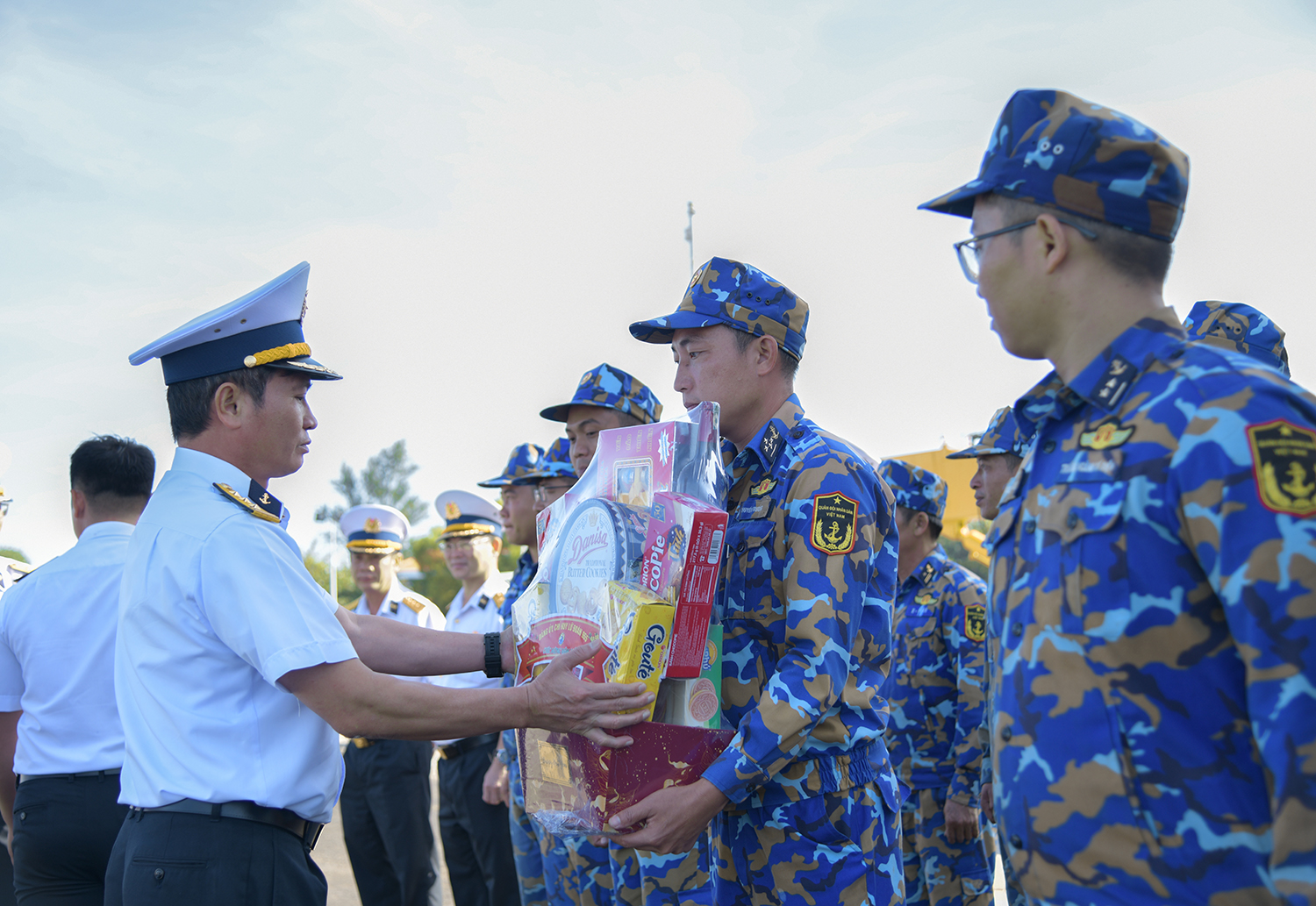 Dịp này, đoàn công tác của Lữ đoàn đã trao quà tặng cán bộ, chiến sĩ các tàu làm nhiệm vụ trực tết.