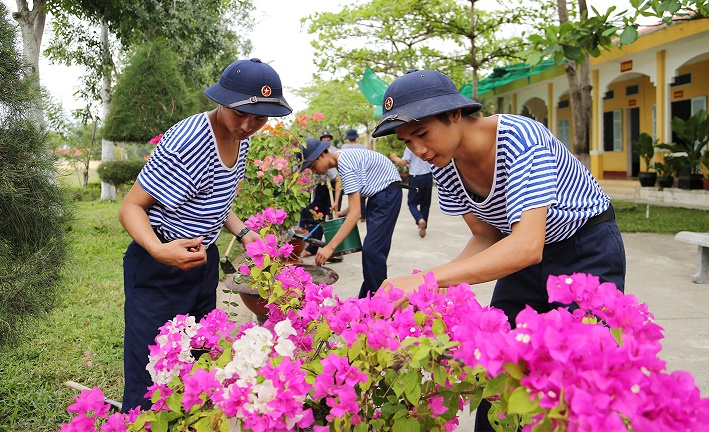 Chiến sĩ mới chăm sóc vườn hoa, cây cảnh tại đơn vị