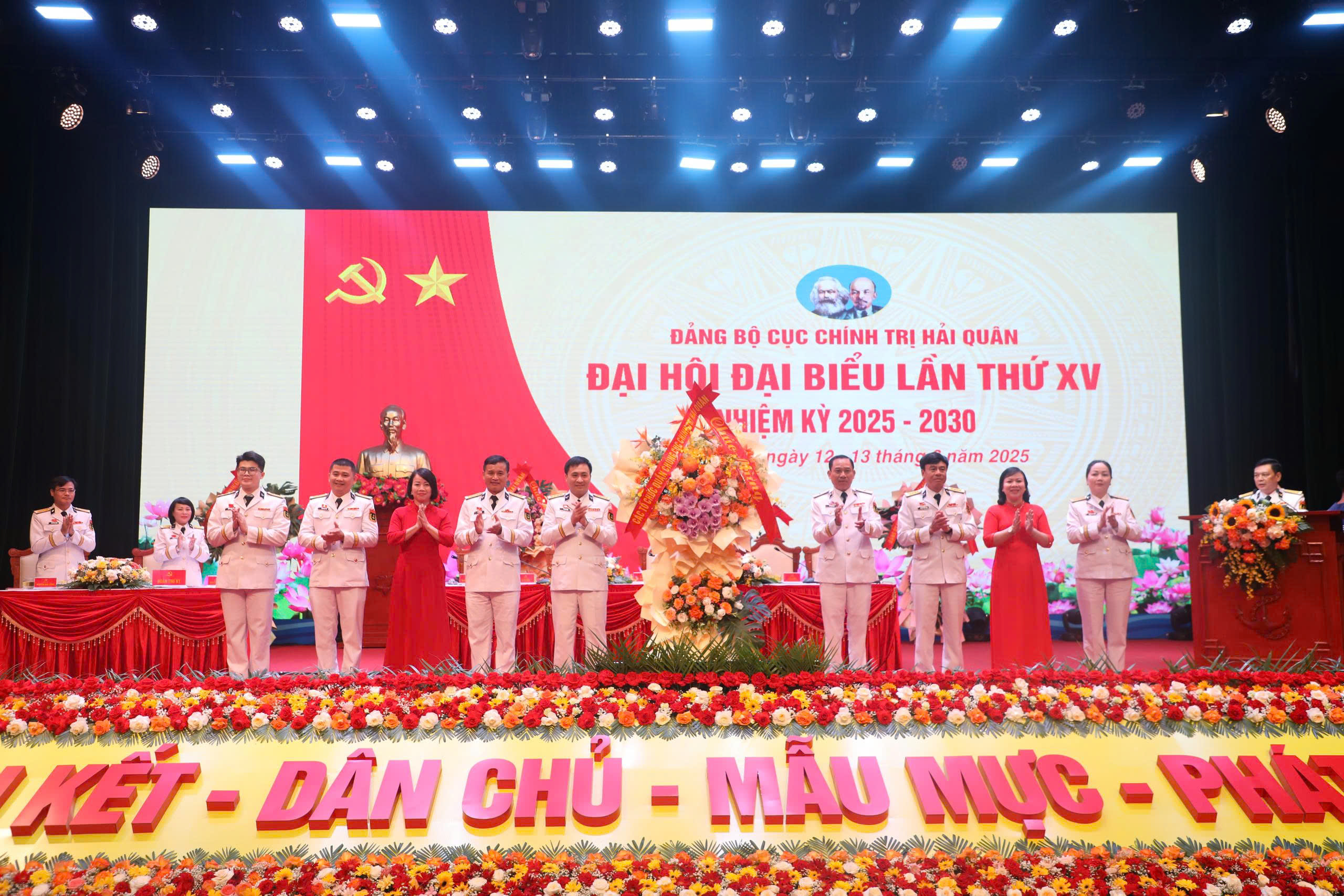 Đồng chí Bí thư Đảng ủy, Chính ủy Quân chủng tặng hoa chúc mừng Ban chấp hành Đảng bộ Cục Chính trị nhiệm kỳ mới và đoàn đại biểu đi dự Đại hội đại biểu lần thứ XIV Quân chủng Hải quân