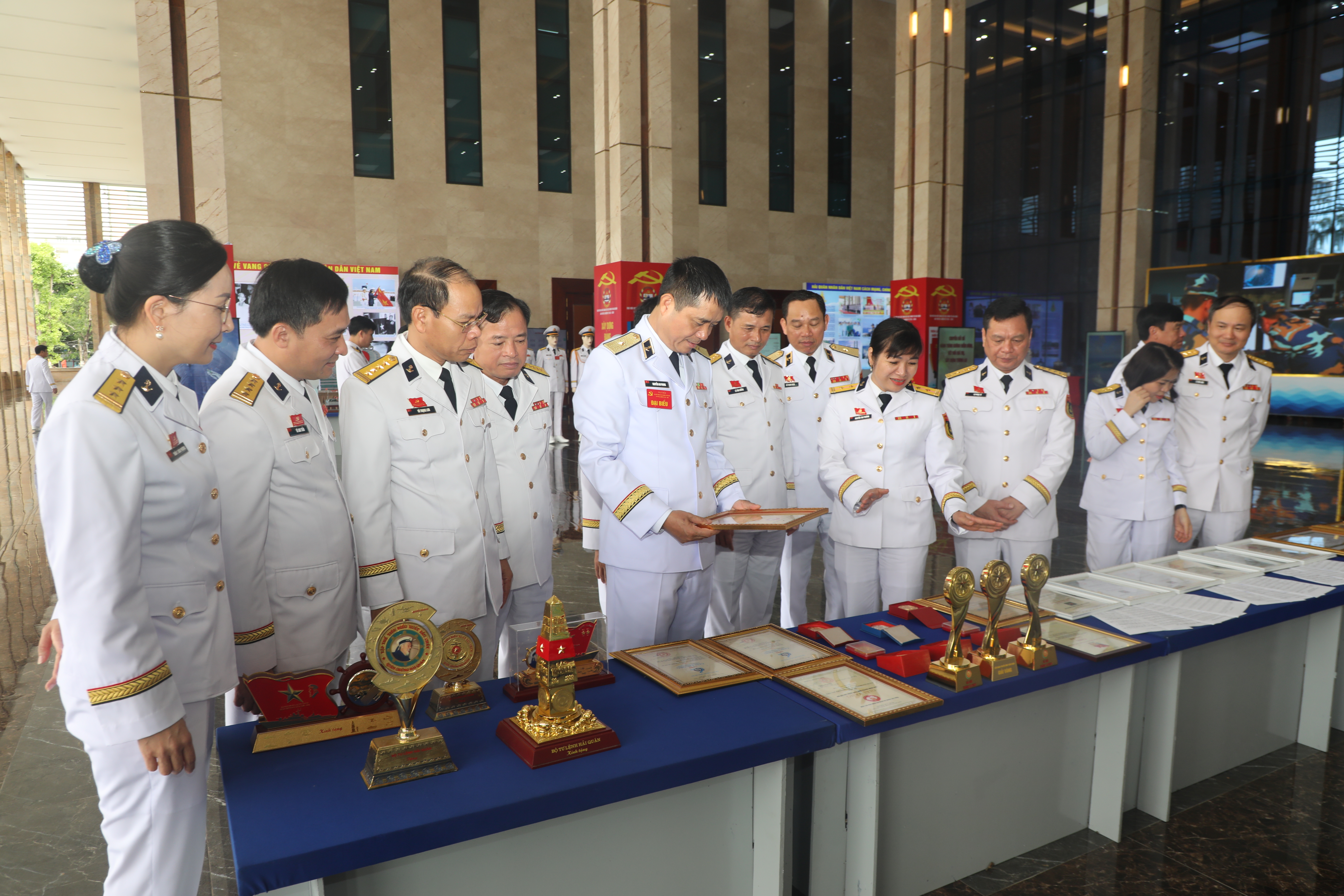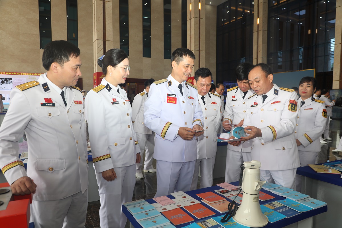 Thủ trưởng Bộ Tư lệnh Hải quân cùng các đại biểu tham quan mô hình, sản phẩm trưng bày tại đại hội