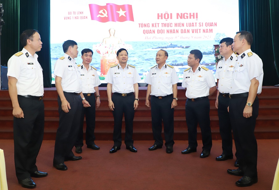 Đồng chí Chính ủy Hải quân yêu cầu: Thời gian tới, Vùng 1 tiếp tục nghiên cứu, quán triệt các văn bản, chỉ thị về thực hiện Luật Sĩ quan, tham mưu, đề xuất sửa đổi bổ sung các văn bản quy phạm pháp luật thuộc thẩm quyền và những vấn đề bất cập trong thực tiễn thực hiện Luật với cấp trên; rà soát, nghiên cứu thực hiện nghiêm các văn bản của Chính phủ, Quân ủy Trung ương, Bộ Quốc phòng, Quân chủng trong thực hiện Luật; đặc biệt trong việc nhận xét cán bộ…