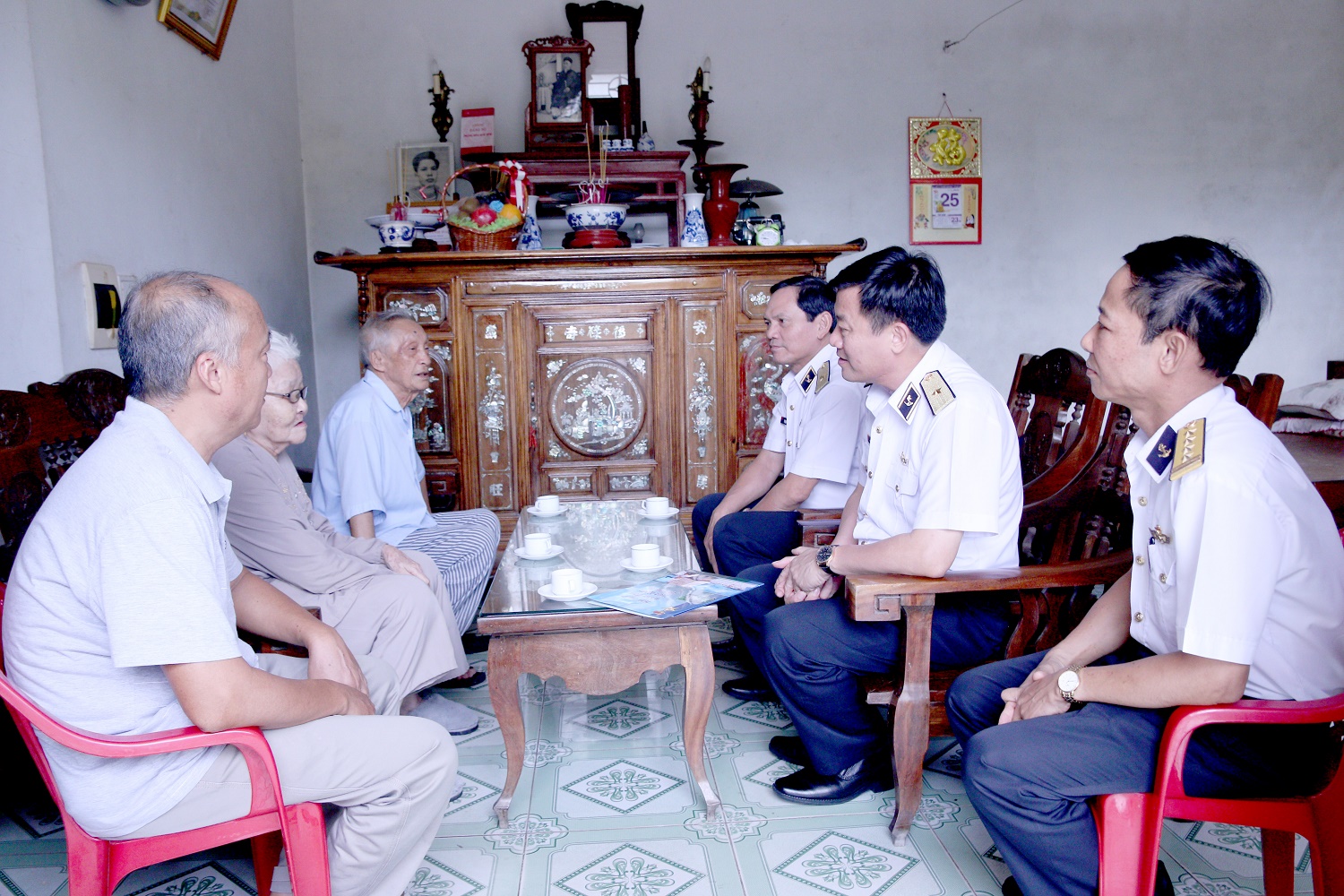 Chuẩn Đô đốc Phạm Văn Vững (Người ngồi giữa bên phải) thăm hỏi, động viên gia đình Anh hùng, liệt sĩ Đồng Quốc Bình