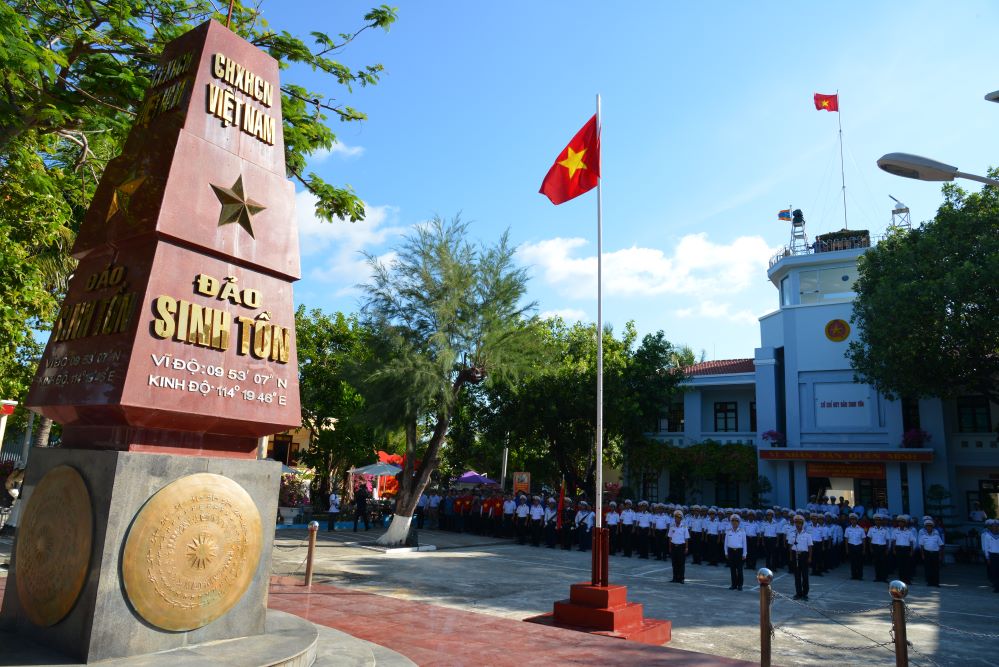 Đoàn công tác chào cờ cùng quân dân xã đảo Sinh Tồn