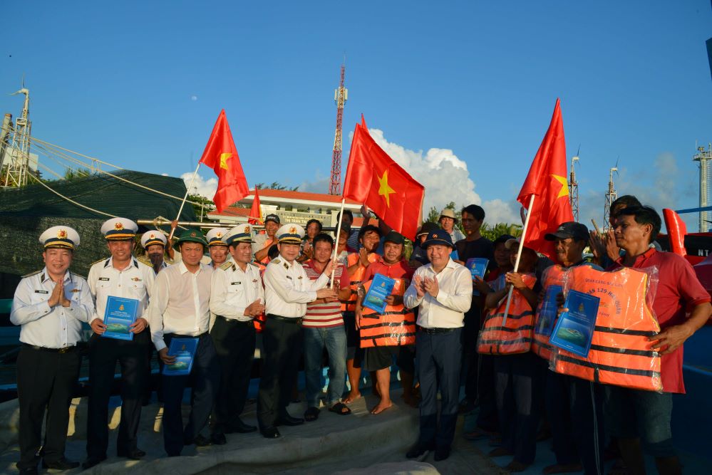 Đoàn công tác tặng cờ Tổ quốc, áo phao cho ngư dân ở Âu tàu đảo Trường Sa